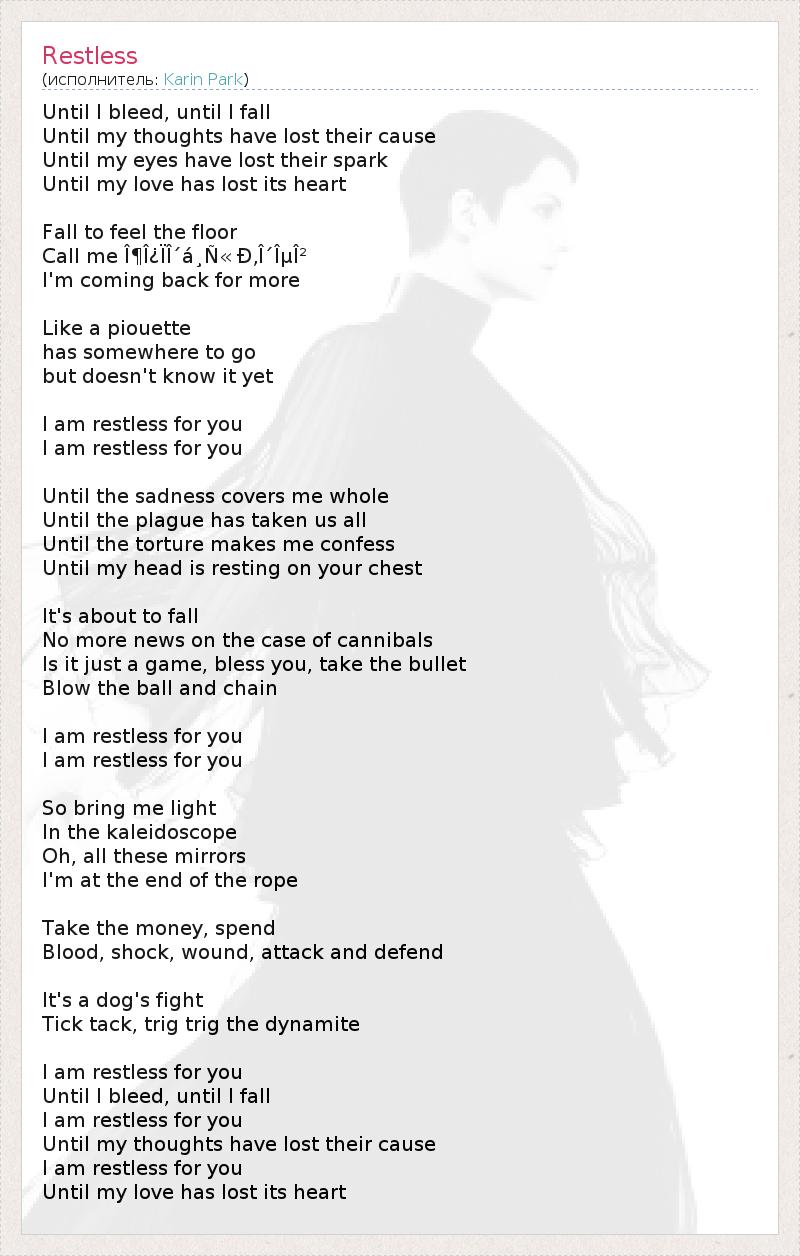 Until I bleed, until I fall Until my thoughts have lost their cause Until my eyes have lost their spark Until my love has lost its heart Fall to feel the floor Call me ζοÏδá¸Ñ« Ђδεβ I'm coming back for more Like a piouette has somewhere to go but doesn't know it yet I am restless for you I am restless for you Until the sadness covers me whole Until the plague has taken us all Until the torture makes me confess Until my head is resting on your chest It's about to fall No more news on the case of cannibals Is it just a game, bless you, take the bullet Blow the ball and chain I am restless for you I am restless for you So bring me light In the kaleidoscope Oh, all these mirrors I'm at the end of the rope Take the money, spend Blood, shock, wound, attack and defend It's a dog's fight Tick tack, trig trig the dynamite I am restless for you Until I bleed, until I fall I am restless for you Until my thoughts have lost their cause I am restless for you Until my love has lost its heart