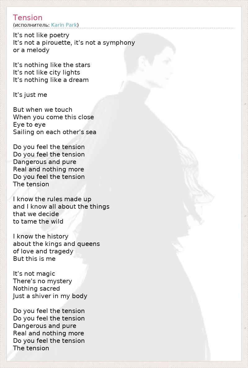 It's not like poetry It's not a pirouette, it's not a symphony or a melody It's nothing like the stars It's not like city lights It's nothing like a dream It's just me But when we touch When you come this close Eye to eye Sailing on each other's sea Do you feel the tension Do you feel the tension Dangerous and pure Real and nothing more Do you feel the tension The tension I know the rules made up and I know all about the things that we decide to tame the wild I know the history about the kings and queens of love and tragedy But this is me It's not magic There's no mystery Nothing sacred Just a shiver in my body Do you feel the tension Do you feel the tension Dangerous and pure Real and nothing more Do you feel the tension The tension