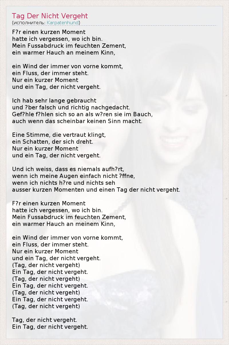 F?r einen kurzen Moment hatte ich vergessen, wo ich bin. Mein Fussabdruck im feuchten Zement, ein warmer Hauch an meinem Kinn, ein Wind der immer von vorne kommt, ein Fluss, der immer steht. Nur ein kurzer Moment und ein Tag, der nicht vergeht. Ich hab sehr lange gebraucht und ?ber falsch und richtig nachgedacht. Gef?hle f?hlen sich so an als w?ren sie im Bauch, auch wenn das scheinbar keinen Sinn macht. Eine Stimme, die vertraut klingt, ein Schatten, der sich dreht. Nur ein kurzer Moment und ein Tag, der nicht vergeht. Und ich weiss, dass es niemals aufh?rt, wenn ich meine Augen einfach nicht ?ffne, wenn ich nichts h?re und nichts seh ausser kurzen Momenten und einen Tag der nicht vergeht. F?r einen kurzen Moment hatte ich vergessen, wo ich bin. Mein Fussabdruck im feuchten Zement, ein warmer Hauch an meinem Kinn, ein Wind der immer von vorne kommt, ein Fluss, der immer steht. Nur ein kurzer Moment und ein Tag, der nicht vergeht. (Tag, der nicht vergeht) Ein Tag, der nicht vergeht. (Tag, der nicht vergeht) Ein Tag, der nicht vergeht. (Tag, der nicht vergeht) Ein Tag, der nicht vergeht. (Tag, der nicht vergeht) Tag, der nicht vergeht. Ein Tag, der nicht vergeht.