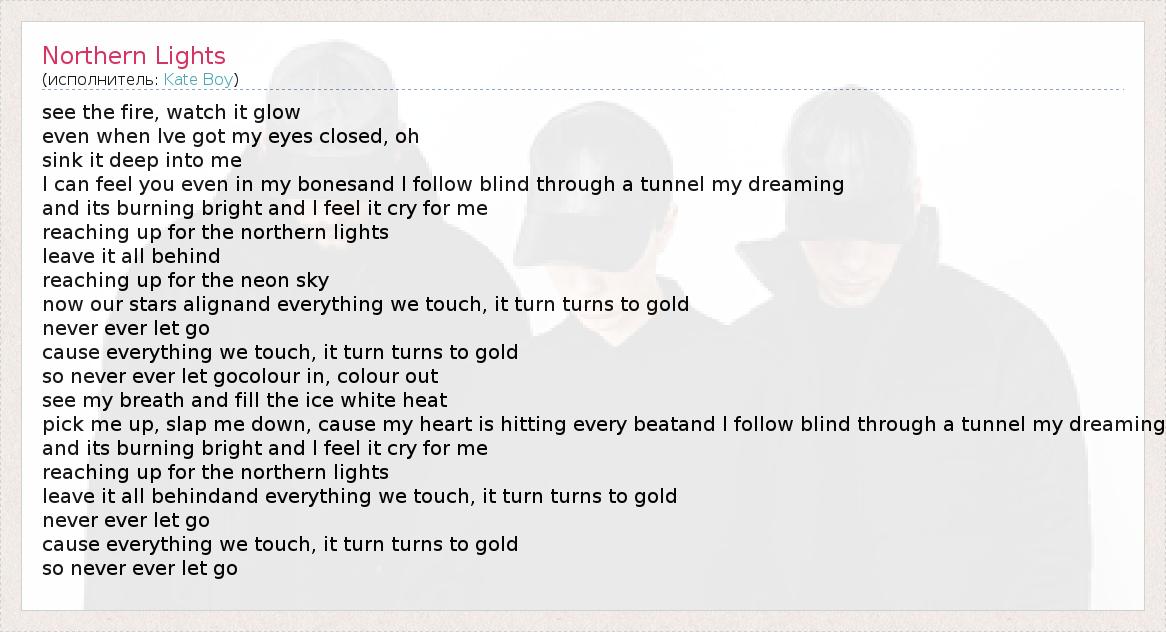 Это интересно:Kate Boy это новая синти-поп группа из Швеции, в составе которой певица и автор текстов Kate Akhurst и продюсерская компания Rocket Boy (Hampus Nordgren Hemlin, Oskar Sikow Engström и Markus Dextegen).Пока что у группы только два сингла "Northern lights" и "In your eyes".
