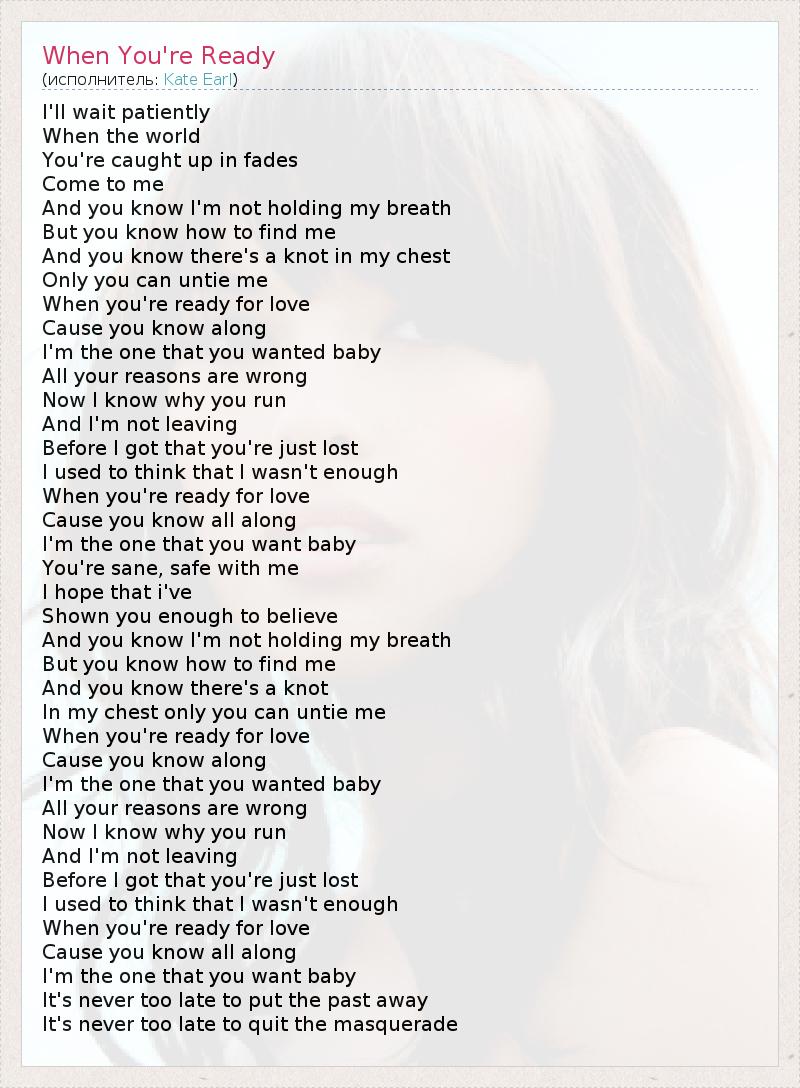 I'll wait patiently When the world You're caught up in fades Come to me And you know I'm not holding my breath But you know how to find me And you know there's a knot in my chest Only you can untie me When you're ready for love Cause you know along I'm the one that you wanted baby All your reasons are wrong Now I know why you run And I'm not leaving Before I got that you're just lost I used to think that I wasn't enough When you're ready for love Cause you know all along I'm the one that you want baby You're sane, safe with me I hope that i've Shown you enough to believe And you know I'm not holding my breath But you know how to find me And you know there's a knot In my chest only you can untie me When you're ready for love Cause you know along I'm the one that you wanted baby All your reasons are wrong Now I know why you run And I'm not leaving Before I got that you're just lost I used to think that I wasn't enough When you're ready for love Cause you know all along I'm the one that you want baby It's never too late to put the past away It's never too late to quit the masquerade