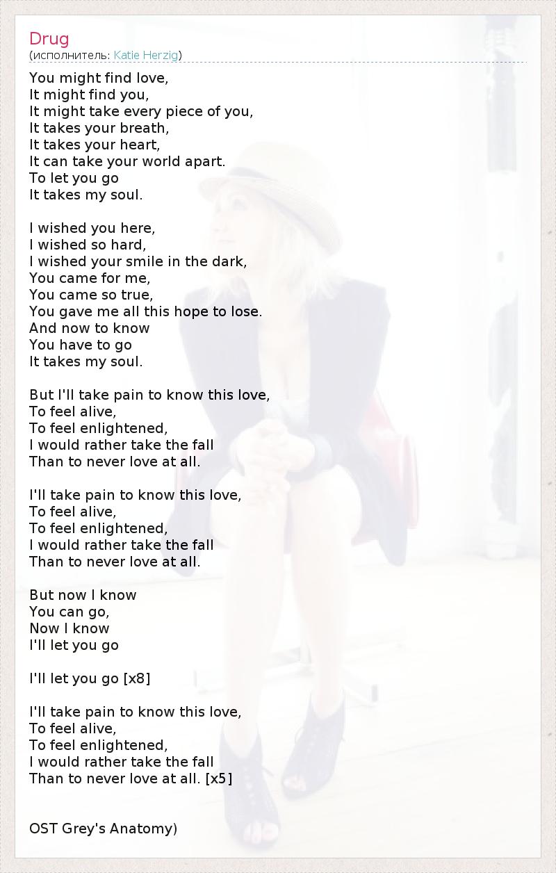 You might find love, It might find you, It might take every piece of you, It takes your breath, It takes your heart, It can take your world apart. To let you go It takes my soul. I wished you here, I wished so hard, I wished your smile in the dark, You came for me, You came so true, You gave me all this hope to lose. And now to know You have to go It takes my soul. But I'll take pain to know this love, To feel alive, To feel enlightened, I would rather take the fall Than to never love at all. I'll take pain to know this love, To feel alive, To feel enlightened, I would rather take the fall Than to never love at all. But now I know You can go, Now I know I'll let you go I'll let you go [x8] I'll take pain to know this love, To feel alive, To feel enlightened, I would rather take the fall Than to never love at all. [x5] OST Grey's Anatomy)