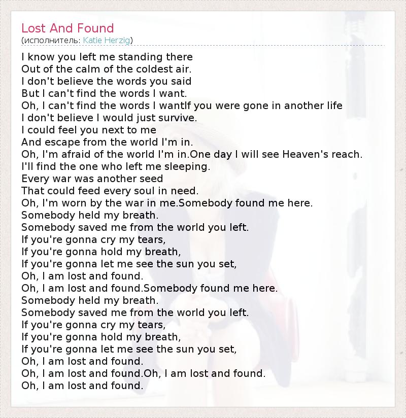 I know you left me standing there Out of the calm of the coldest air. I don't believe the words you said But I can't find the words I want. Oh, I can't find the words I wantIf you were gone in another life I don't believe I would just survive. I could feel you next to me And escape from the world I'm in. Oh, I'm afraid of the world I'm in.One day I will see Heaven's reach. I'll find the one who left me sleeping. Every war was another seed That could feed every soul in need. Oh, I'm worn by the war in me.Somebody found me here. Somebody held my breath. Somebody saved me from the world you left. If you're gonna cry my tears, If you're gonna hold my breath, If you're gonna let me see the sun you set, Oh, I am lost and found. Oh, I am lost and found.Somebody found me here. Somebody held my breath. Somebody saved me from the world you left. If you're gonna cry my tears, If you're gonna hold my breath, If you're gonna let me see the sun you set, Oh, I am lost and found. Oh, I am lost and found.Oh, I am lost and found. Oh, I am lost and found.
