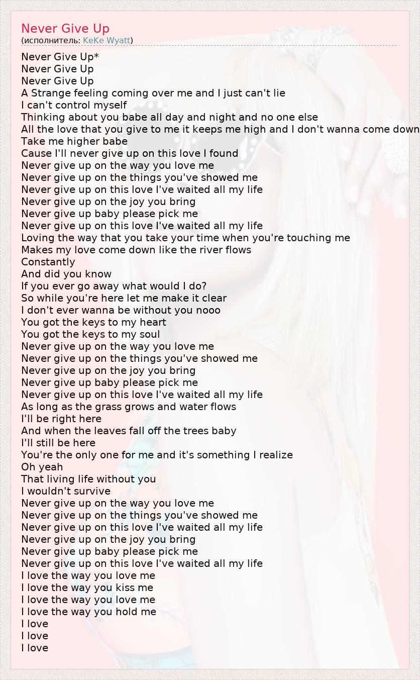 Never Give Up* Never Give Up Never Give Up A Strange feeling coming over me and I just can't lie I can't control myself Thinking about you babe all day and night and no one else All the love that you give to me it keeps me high and I don't wanna come down Take me higher babe Cause I'll never give up on this love I found Never give up on the way you love me Never give up on the things you've showed me Never give up on this love I've waited all my life Never give up on the joy you bring Never give up baby please pick me Never give up on this love I've waited all my life Loving the way that you take your time when you're touching me Makes my love come down like the river flows Constantly And did you know If you ever go away what would I do? So while you're here let me make it clear I don't ever wanna be without you nooo You got the keys to my heart You got the keys to my soul Never give up on the way you love me Never give up on the things you've showed me Never give up on the joy you bring Never give up baby please pick me Never give up on this love I've waited all my life As long as the grass grows and water flows I'll be right here And when the leaves fall off the trees baby I'll still be here You're the only one for me and it's something I realize Oh yeah That living life without you I wouldn't survive Never give up on the way you love me Never give up on the things you've showed me Never give up on this love I've waited all my life Never give up on the joy you bring Never give up baby please pick me Never give up on this love I've waited all my life I love the way you love me I love the way you kiss me I love the way you love me I love the way you hold me I love I love I love