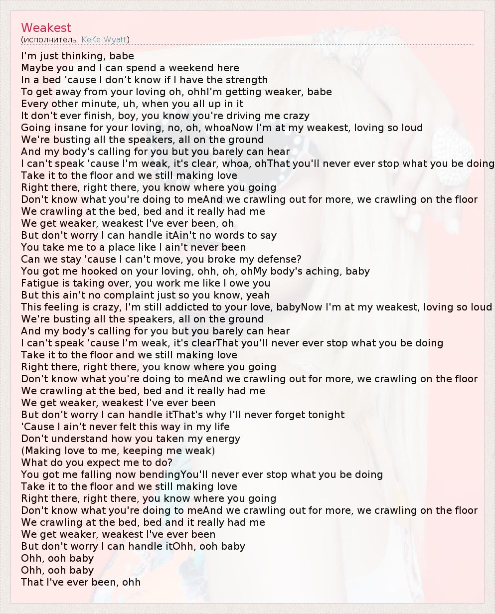 I'm just thinking, babe Maybe you and I can spend a weekend here In a bed 'cause I don't know if I have the strength To get away from your loving oh, ohhI'm getting weaker, babe Every other minute, uh, when you all up in it It don't ever finish, boy, you know you're driving me crazy Going insane for your loving, no, oh, whoaNow I'm at my weakest, loving so loud We're busting all the speakers, all on the ground And my body's calling for you but you barely can hear I can't speak 'cause I'm weak, it's clear, whoa, ohThat you'll never ever stop what you be doing Take it to the floor and we still making love Right there, right there, you know where you going Don't know what you're doing to meAnd we crawling out for more, we crawling on the floor We crawling at the bed, bed and it really had me We get weaker, weakest I've ever been, oh But don't worry I can handle itAin't no words to say You take me to a place like I ain't never been Can we stay 'cause I can't move, you broke my defense? You got me hooked on your loving, ohh, oh, ohMy body's aching, baby Fatigue is taking over, you work me like I owe you But this ain't no complaint just so you know, yeah This feeling is crazy, I'm still addicted to your love, babyNow I'm at my weakest, loving so loud We're busting all the speakers, all on the ground And my body's calling for you but you barely can hear I can't speak 'cause I'm weak, it's clearThat you'll never ever stop what you be doing Take it to the floor and we still making love Right there, right there, you know where you going Don't know what you're doing to meAnd we crawling out for more, we crawling on the floor We crawling at the bed, bed and it really had me We get weaker, weakest I've ever been But don't worry I can handle itThat's why I'll never forget tonight 'Cause I ain't never felt this way in my life Don't understand how you taken my energy (Making love to me, keeping me weak) What do you expect me to do? You got me falling now bendingYou'll never ever stop what you be doing Take it to the floor and we still making love Right there, right there, you know where you going Don't know what you're doing to meAnd we crawling out for more, we crawling on the floor We crawling at the bed, bed and it really had me We get weaker, weakest I've ever been But don't worry I can handle itOhh, ooh baby Ohh, ooh baby Ohh, ooh baby That I've ever been, ohh