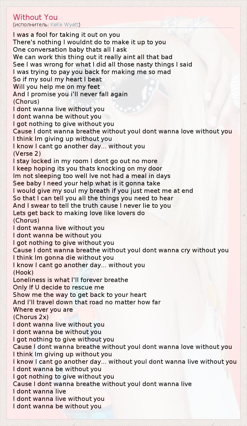 I was a fool for taking it out on you There's nothing I wouldnt do to make it up to you One conversation baby thats all I ask We can work this thing out it really aint all that bad See I was wrong for what I did all those nasty things I said I was trying to pay you back for making me so mad So if my soul my heart I beat Will you help me on my feet And I promise you i'll never fall again (Chorus) I dont wanna live without you I dont wanna be without you I got nothing to give without you Cause I dont wanna breathe without youI dont wanna love without you I think Im giving up without you I know I cant go another day... without you (Verse 2) I stay locked in my room I dont go out no more I keep hoping its you thats knocking on my door Im not sleeping too well Ive not had a meal in days See baby I need your help what is it gonna take I would give my soul my breath if you just meet me at end So that I can tell you all the things you need to hear And I swear to tell the truth cause I never lie to you Lets get back to making love like lovers do (Chorus) I dont wanna live without you I dont wanna be without you I got nothing to give without you Cause I dont wanna breathe without youI dont wanna cry without you I think Im gonna die without you I know I cant go another day... without you (Hook) Loneliness is what I'll forever breathe Only If U decide to rescue me Show me the way to get back to your heart And I'll travel down that road no matter how far Where ever you are (Chorus 2x) I dont wanna live without you I dont wanna be without you I got nothing to give without you Cause I dont wanna breathe without youI dont wanna love without you I think Im giving up without you I know I cant go another day... without youI dont wanna live without you I dont wanna be without you I got nothing to give without you Cause I dont wanna breathe without youI dont wanna live I dont wanna live I dont wanna live without you I dont wanna be without you