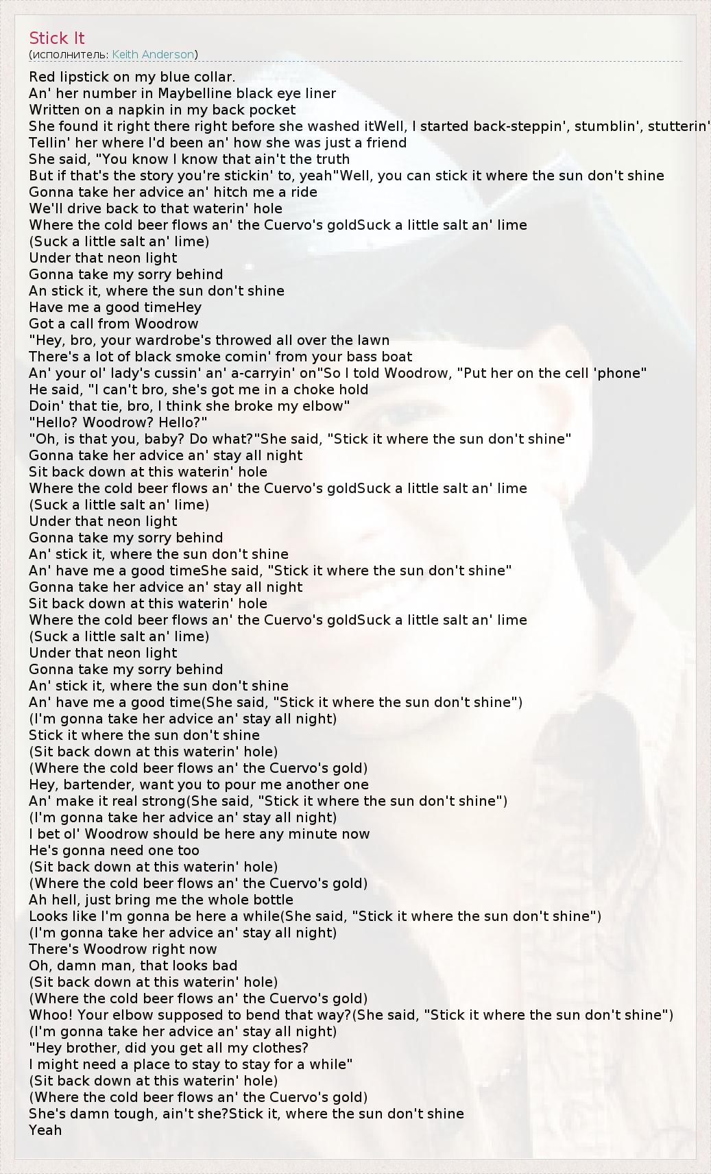 Это интересно:Кейт Андерсон (Keith Anderson) родился 12 января 1968 г., в г. Майами, шт. Оклахома.Американский кантри-исполнитель. До того, как заключить свйо первый контракт со звукозаписывающей компанией, был со-автором песни "Beer Run (B Double E Double Are You In?)", спев её дуэтом с Гартом Бруксом (Garth Brooks) и Джорджем Джонсом (George Jones), песня была выпущена в 2001 г.Андерсон подписал свой контракт как артист с Ариста Нэшвилл... продолжение