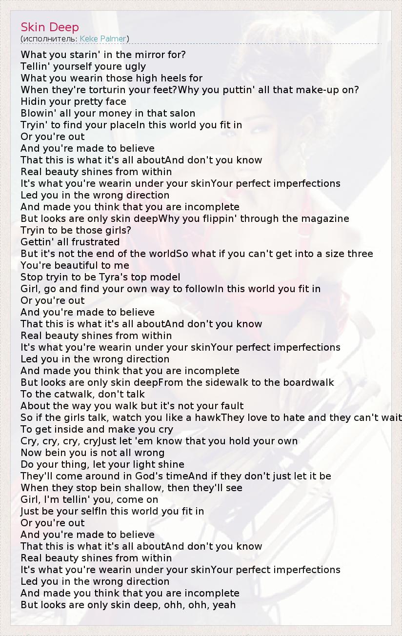 What you starin' in the mirror for? Tellin' yourself youre ugly What you wearin those high heels for When they're torturin your feet?Why you puttin' all that make-up on? Hidin your pretty face Blowin' all your money in that salon Tryin' to find your placeIn this world you fit in Or you're out And you're made to believe That this is what it's all aboutAnd don't you know Real beauty shines from within It's what you're wearin under your skinYour perfect imperfections Led you in the wrong direction And made you think that you are incomplete But looks are only skin deepWhy you flippin' through the magazine Tryin to be those girls? Gettin' all frustrated But it's not the end of the worldSo what if you can't get into a size three You're beautiful to me Stop tryin to be Tyra's top model Girl, go and find your own way to followIn this world you fit in Or you're out And you're made to believe That this is what it's all aboutAnd don't you know Real beauty shines from within It's what you're wearin under your skinYour perfect imperfections Led you in the wrong direction And made you think that you are incomplete But looks are only skin deepFrom the sidewalk to the boardwalk To the catwalk, don't talk About the way you walk but it's not your fault So if the girls talk, watch you like a hawkThey love to hate and they can't wait To get inside and make you cry Cry, cry, cry, cryJust let 'em know that you hold your own Now bein you is not all wrong Do your thing, let your light shine They'll come around in God's timeAnd if they don't just let it be When they stop bein shallow, then they'll see Girl, I'm tellin' you, come on Just be your selfIn this world you fit in Or you're out And you're made to believe That this is what it's all aboutAnd don't you know Real beauty shines from within It's what you're wearin under your skinYour perfect imperfections Led you in the wrong direction And made you think that you are incomplete But looks are only skin deep, ohh, ohh, yeah