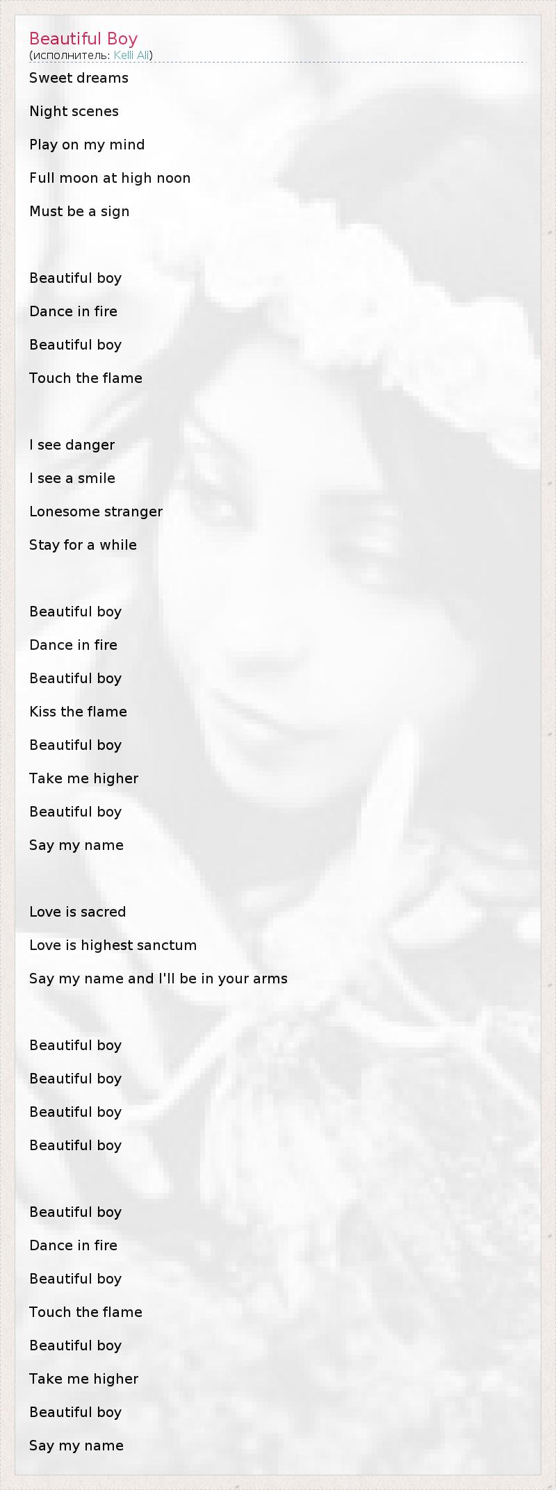 Sweet dreams Night scenes Play on my mind Full moon at high noon Must be a sign Beautiful boy Dance in fire Beautiful boy Touch the flame I see danger I see a smile Lonesome stranger Stay for a while Beautiful boy Dance in fire Beautiful boy Kiss the flame Beautiful boy Take me higher Beautiful boy Say my name Love is sacred Love is highest sanctum Say my name and I'll be in your arms Beautiful boy Beautiful boy Beautiful boy Beautiful boy Beautiful boy Dance in fire Beautiful boy Touch the flame Beautiful boy Take me higher Beautiful boy Say my name