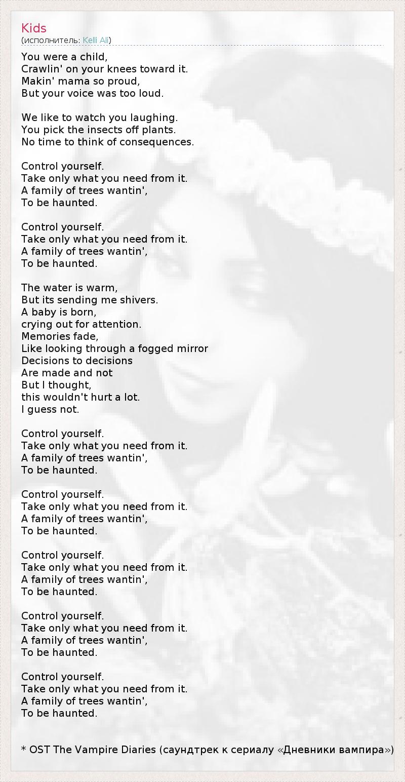 You were a child, Crawlin' on your knees toward it. Makin' mama so proud, But your voice was too loud. We like to watch you laughing. You pick the insects off plants. No time to think of consequences. Control yourself. Take only what you need from it. A family of trees wantin', To be haunted. Control yourself. Take only what you need from it. A family of trees wantin', To be haunted. The water is warm, But its sending me shivers. A baby is born, crying out for attention. Memories fade, Like looking through a fogged mirror Decisions to decisions Are made and not But I thought, this wouldn't hurt a lot. I guess not. Control yourself. Take only what you need from it. A family of trees wantin', To be haunted. Control yourself. Take only what you need from it. A family of trees wantin', To be haunted. Control yourself. Take only what you need from it. A family of trees wantin', To be haunted. Control yourself. Take only what you need from it. A family of trees wantin', To be haunted. Control yourself. Take only what you need from it. A family of trees wantin', To be haunted. * OST The Vampire Diaries (саундтрек к сериалу «Дневники вампира»)