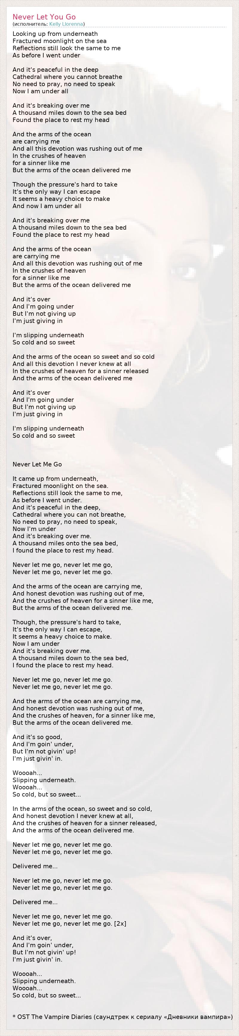 Looking up from underneath Fractured moonlight on the sea Reflections still look the same to me As before I went under And it's peaceful in the deep Cathedral where you cannot breathe No need to pray, no need to speak Now I am under all And it's breaking over me A thousand miles down to the sea bed Found the place to rest my head And the arms of the ocean are carrying me And all this devotion was rushing out of me In the crushes of heaven for a sinner like me But the arms of the ocean delivered me Though the pressure's hard to take It's the only way I can escape It seems a heavy choice to make And now I am under all And it's breaking over me A thousand miles down to the sea bed Found the place to rest my head And the arms of the ocean are carrying me And all this devotion was rushing out of me In the crushes of heaven for a sinner like me But the arms of the ocean delivered me And it's over And I'm going under But I'm not giving up I'm just giving in I'm slipping underneath So cold and so sweet And the arms of the ocean so sweet and so cold And all this devotion I never knew at all In the crushes of heaven for a sinner released And the arms of the ocean delivered me And it's over And I'm going under But I'm not giving up I'm just giving in I'm slipping underneath So cold and so sweet Never Let Me Go It came up from underneath, Fractured moonlight on the sea. Reflections still look the same to me, As before I went under. And it's peaceful in the deep, Cathedral where you can not breathe, No need to pray, no need to speak, Now I'm under And it's breaking over me. A thousand miles onto the sea bed, I found the place to rest my head. Never let me go, never let me go, Never let me go, never let me go. And the arms of the ocean are carrying me, And honest devotion was rushing out of me, And the crushes of heaven for a sinner like me, But the arms of the ocean delivered me. Though, the pressure's hard to take, It's the only way I can escape, It seems a heavy choice to make. Now I am under And it's breaking over me. A thousand miles down to the sea bed, I found the place to rest my head. Never let me go, never let me go. Never let me go, never let me go. And the arms of the ocean are carrying me, And honest devotion was rushing out of me, And the crushes of heaven, for a sinner like me, But the arms of the ocean delivered me. And it's so good, And I'm goin' under, But I'm not givin' up! I'm just givin' in. Woooah... Slipping underneath. Woooah... So cold, but so sweet... In the arms of the ocean, so sweet and so cold, And honest devotion I never knew at all, And the crushes of heaven for a sinner released, And the arms of the ocean delivered me. Never let me go, never let me go. Never let me go, never let me go. Delivered me... Never let me go, never let me go. Never let me go, never let me go. Delivered me... Never let me go, never let me go. Never let me go, never let me go. [2x] And it's over, And I'm goin' under, But I'm not givin' up! I'm just givin' in. Woooah... Slipping underneath. Woooah... So cold, but so sweet... * OST The Vampire Diaries (саундтрек к сериалу «Дневники вампира»)
