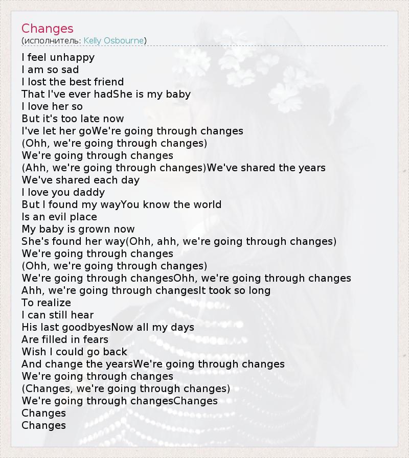 I feel unhappy I am so sad I lost the best friend That I've ever hadShe is my baby I love her so But it's too late now I've let her goWe're going through changes (Ohh, we're going through changes) We're going through changes (Ahh, we're going through changes)We've shared the years We've shared each day I love you daddy But I found my wayYou know the world Is an evil place My baby is grown now She's found her way(Ohh, ahh, we're going through changes) We're going through changes (Ohh, we're going through changes) We're going through changesOhh, we're going through changes Ahh, we're going through changesIt took so long To realize I can still hear His last goodbyesNow all my days Are filled in fears Wish I could go back And change the yearsWe're going through changes We're going through changes (Changes, we're going through changes) We're going through changesChanges Changes Changes