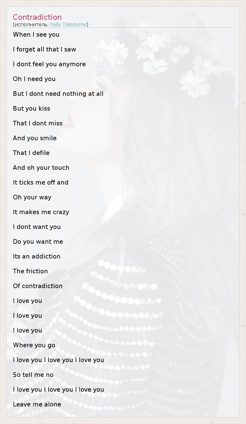 When I see you I forget all that I saw I dont feel you anymore Oh I need you But I dont need nothing at all But you kiss That I dont miss And you smile That I defile And oh your touch It ticks me off and Oh your way It makes me crazy I dont want you Do you want me Its an addiction The friction Of contradiction I love you I love you I love you Where you go I love you I love you I love you So tell me no I love you I love you I love you Leave me alone