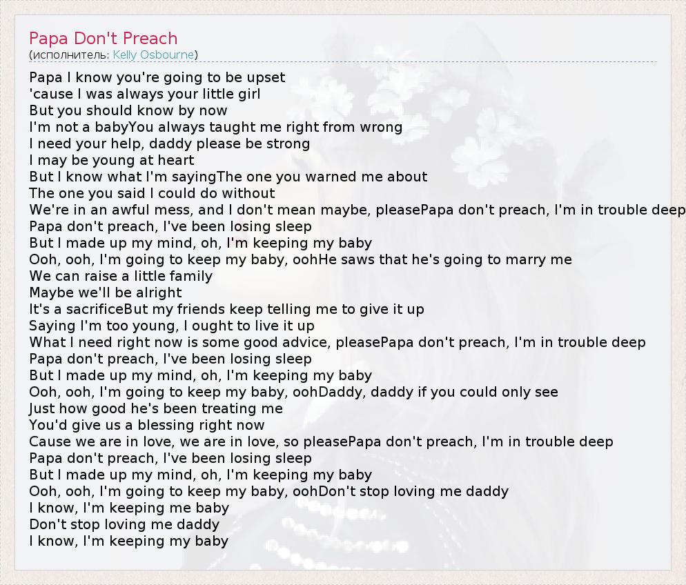 Papa I know you're going to be upset 'cause I was always your little girl But you should know by now I'm not a babyYou always taught me right from wrong I need your help, daddy please be strong I may be young at heart But I know what I'm sayingThe one you warned me about The one you said I could do without We're in an awful mess, and I don't mean maybe, pleasePapa don't preach, I'm in trouble deep Papa don't preach, I've been losing sleep But I made up my mind, oh, I'm keeping my baby Ooh, ooh, I'm going to keep my baby, oohHe saws that he's going to marry me We can raise a little family Maybe we'll be alright It's a sacrificeBut my friends keep telling me to give it up Saying I'm too young, I ought to live it up What I need right now is some good advice, pleasePapa don't preach, I'm in trouble deep Papa don't preach, I've been losing sleep But I made up my mind, oh, I'm keeping my baby Ooh, ooh, I'm going to keep my baby, oohDaddy, daddy if you could only see Just how good he's been treating me You'd give us a blessing right now Cause we are in love, we are in love, so pleasePapa don't preach, I'm in trouble deep Papa don't preach, I've been losing sleep But I made up my mind, oh, I'm keeping my baby Ooh, ooh, I'm going to keep my baby, oohDon't stop loving me daddy I know, I'm keeping me baby Don't stop loving me daddy I know, I'm keeping my baby