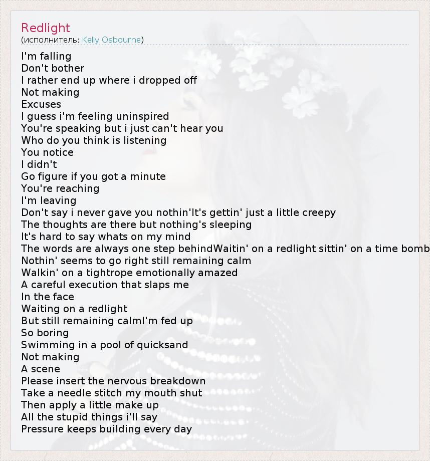 I'm falling Don't bother I rather end up where i dropped off Not making Excuses I guess i'm feeling uninspired You're speaking but i just can't hear you Who do you think is listening You notice I didn't Go figure if you got a minute You're reaching I'm leaving Don't say i never gave you nothin'It's gettin' just a little creepy The thoughts are there but nothing's sleeping It's hard to say whats on my mind The words are always one step behindWaitin' on a redlight sittin' on a time bomb Nothin' seems to go right still remaining calm Walkin' on a tightrope emotionally amazed A careful execution that slaps me In the face Waiting on a redlight But still remaining calmI'm fed up So boring Swimming in a pool of quicksand Not making A scene Please insert the nervous breakdown Take a needle stitch my mouth shut Then apply a little make up All the stupid things i'll say Pressure keeps building every day