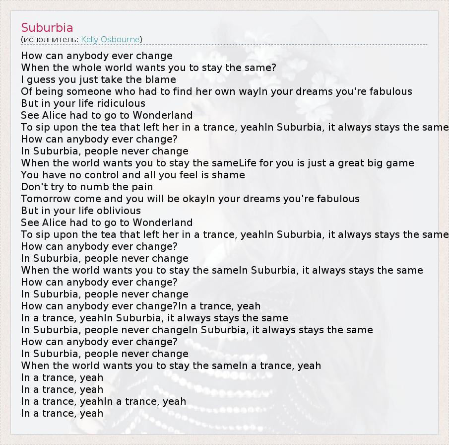 How can anybody ever change When the whole world wants you to stay the same? I guess you just take the blame Of being someone who had to find her own wayIn your dreams you're fabulous But in your life ridiculous See Alice had to go to Wonderland To sip upon the tea that left her in a trance, yeahIn Suburbia, it always stays the same How can anybody ever change? In Suburbia, people never change When the world wants you to stay the sameLife for you is just a great big game You have no control and all you feel is shame Don't try to numb the pain Tomorrow come and you will be okayIn your dreams you're fabulous But in your life oblivious See Alice had to go to Wonderland To sip upon the tea that left her in a trance, yeahIn Suburbia, it always stays the same How can anybody ever change? In Suburbia, people never change When the world wants you to stay the sameIn Suburbia, it always stays the same How can anybody ever change? In Suburbia, people never change How can anybody ever change?In a trance, yeah In a trance, yeahIn Suburbia, it always stays the same In Suburbia, people never changeIn Suburbia, it always stays the same How can anybody ever change? In Suburbia, people never change When the world wants you to stay the sameIn a trance, yeah In a trance, yeah In a trance, yeah In a trance, yeahIn a trance, yeah In a trance, yeah
