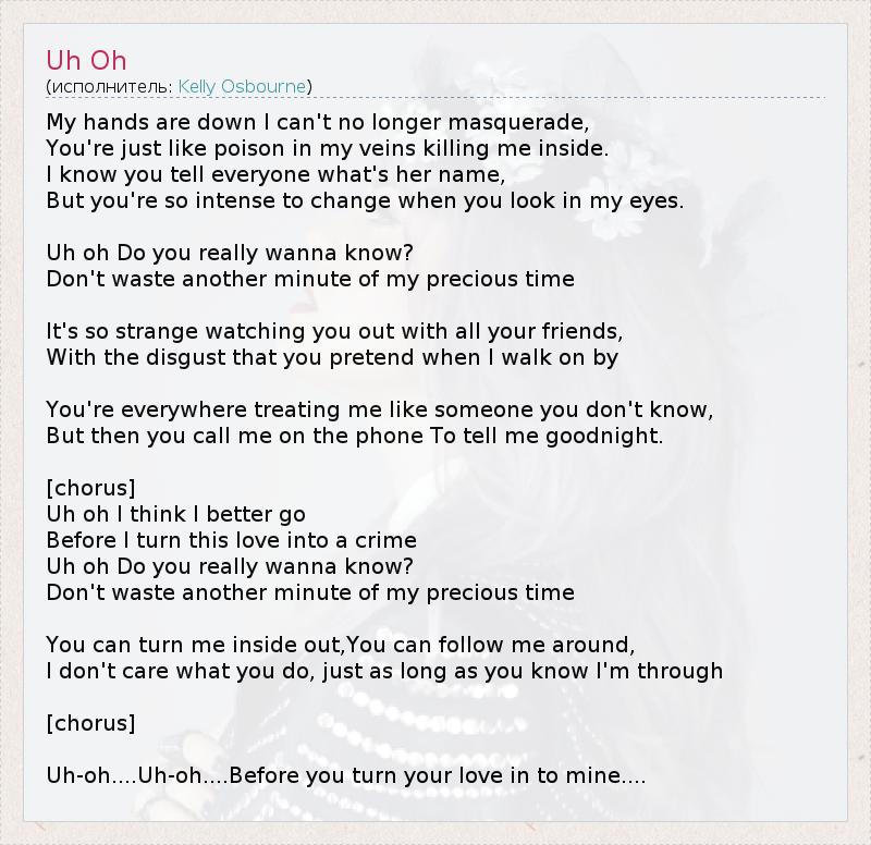 My hands are down I can't no longer masquerade, You're just like poison in my veins killing me inside. I know you tell everyone what's her name, But you're so intense to change when you look in my eyes. Uh oh Do you really wanna know? Don't waste another minute of my precious time It's so strange watching you out with all your friends, With the disgust that you pretend when I walk on by You're everywhere treating me like someone you don't know, But then you call me on the phone To tell me goodnight. [chorus] Uh oh I think I better go Before I turn this love into a crime Uh oh Do you really wanna know? Don't waste another minute of my precious time You can turn me inside out,You can follow me around, I don't care what you do, just as long as you know I'm through [chorus] Uh-oh....Uh-oh....Before you turn your love in to mine....