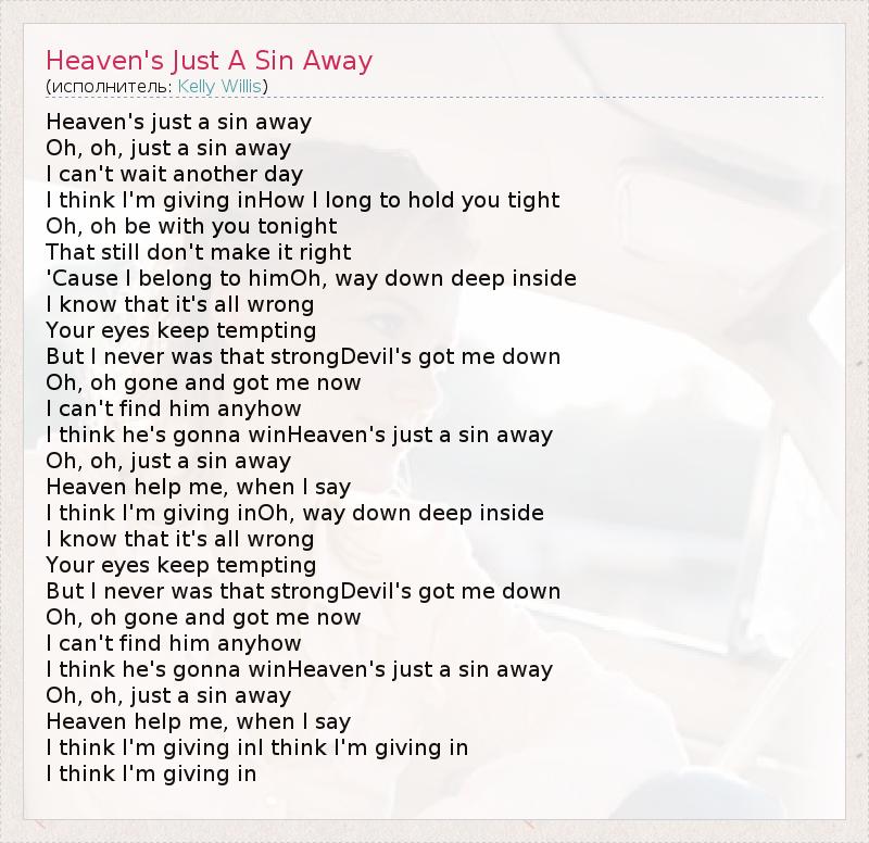Heaven's just a sin away Oh, oh, just a sin away I can't wait another day I think I'm giving inHow I long to hold you tight Oh, oh be with you tonight That still don't make it right 'Cause I belong to himOh, way down deep inside I know that it's all wrong Your eyes keep tempting But I never was that strongDevil's got me down Oh, oh gone and got me now I can't find him anyhow I think he's gonna winHeaven's just a sin away Oh, oh, just a sin away Heaven help me, when I say I think I'm giving inOh, way down deep inside I know that it's all wrong Your eyes keep tempting But I never was that strongDevil's got me down Oh, oh gone and got me now I can't find him anyhow I think he's gonna winHeaven's just a sin away Oh, oh, just a sin away Heaven help me, when I say I think I'm giving inI think I'm giving in I think I'm giving in