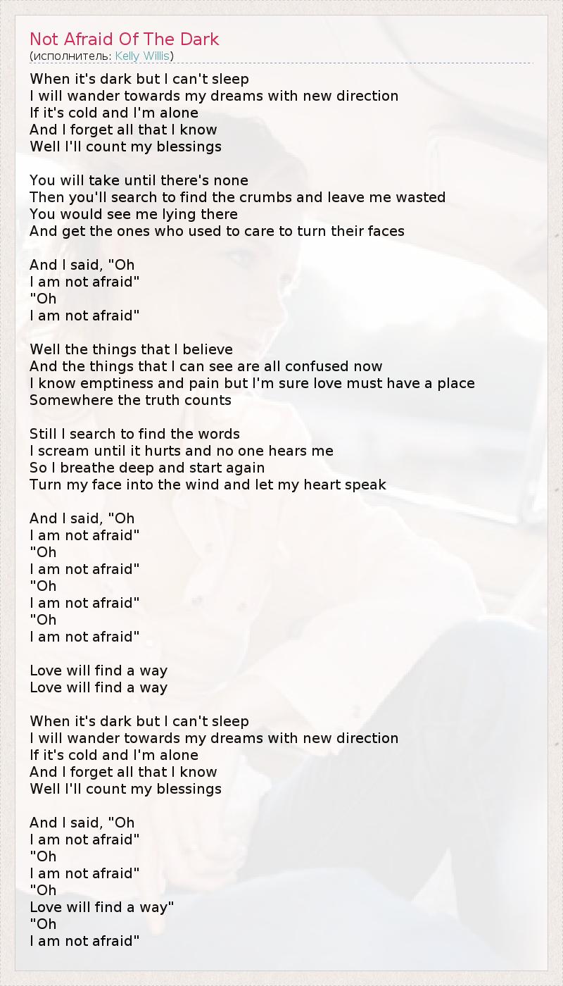Когда темно, и я не могу уснуть, Я побреду в новом направлении к своим мечтам. Если станет холодно, и я буду одинок И забуду все, что знаю, Я буду благодарить свою судьбу. Ты заберешь все, пока ничего не останется, Затем ты будешь искать крошки и оставишь меня опустошенным. Видела бы ты меня, лежащего здесь, И поняла бы тех, кому обычно не было все равно, и кто не отворачивал лиц. И я сказал: "О, Я не боюсь." "О, Я не боюсь." Да, вещи, в которые я верю, И те, что я могу видеть, все спутаны теперь. Я знаю, что такое пустота и боль, но уверен, что должно быть место для любви. Где-то правда имеет значение. Все же я пытаюсь найти слова. Я кричу, пока не станет от этого больно, но никто не слышит меня. Так что я делаю глубокий вдох и начинаю заново, Обращаю свое лицо в ветер и позволяю своему сердцу говорить. И я сказал: "О, Я не боюсь." "О, Я не боюсь." "О, Я не боюсь." "О, Я не боюсь." Любовь отыщет дорогу. Любовь отыщет дорогу. Когда темно, и я не могу уснуть, Я побреду в новом направлении к своим мечтам. Если станет холодно, и я буду одинок И забуду все, что знаю, Я буду благодарить свою судьбу. И я сказал: "О, Я не боюсь." "О, Я не боюсь." "О, Я не боюсь." "О, Я не боюсь."