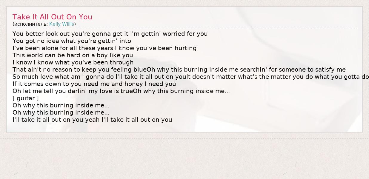 You better look out you're gonna get it I'm gettin' worried for you You got no idea what you're gettin' into I've been alone for all these years I know you've been hurting This world can be hard on a boy like you I know I know what you've been through That ain't no reason to keep you feeling blueOh why this burning inside me searchin' for someone to satisfy me So much love what am I gonna do I'll take it all out on youIt doesn't matter what's the matter you do what you gotta do If it comes down to you need me and honey I need you Oh let me tell you darlin' my love is trueOh why this burning inside me... [ guitar ] Oh why this burning inside me... Oh why this burning inside me... I'll take it all out on you yeah I'll take it all out on you