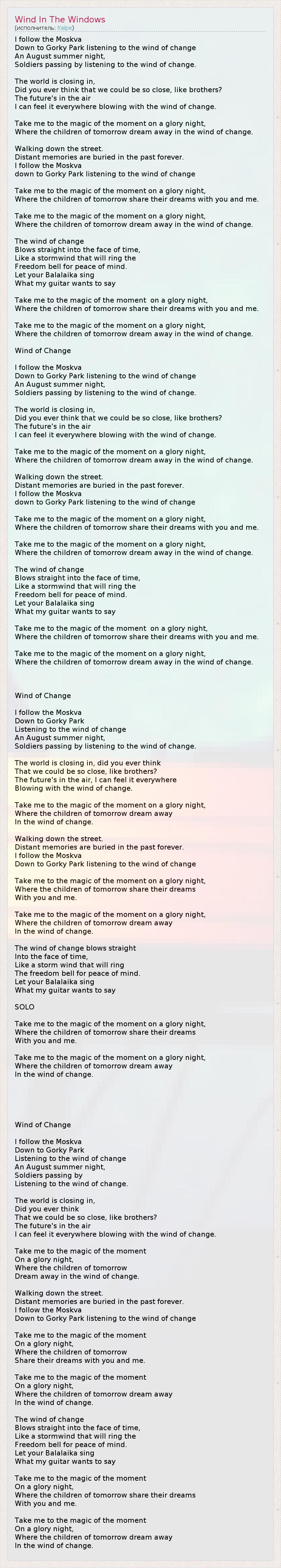 I follow the Moskva Down to Gorky Park listening to the wind of change An August summer night, Soldiers passing by listening to the wind of change. The world is closing in, Did you ever think that we could be so close, like brothers? The future's in the air I can feel it everywhere blowing with the wind of change. Take me to the magic of the moment on a glory night, Where the children of tomorrow dream away in the wind of change. Walking down the street. Distant memories are buried in the past forever. I follow the Moskva down to Gorky Park listening to the wind of change Take me to the magic of the moment on a glory night, Where the children of tomorrow share their dreams with you and me. Take me to the magic of the moment on a glory night, Where the children of tomorrow dream away in the wind of change. The wind of change Blows straight into the face of time, Like a stormwind that will ring the Freedom bell for peace of mind. Let your Balalaika sing What my guitar wants to say Take me to the magic of the moment on a glory night, Where the children of tomorrow share their dreams with you and me. Take me to the magic of the moment on a glory night, Where the children of tomorrow dream away in the wind of change. Wind of Change I follow the Moskva Down to Gorky Park listening to the wind of change An August summer night, Soldiers passing by listening to the wind of change. The world is closing in, Did you ever think that we could be so close, like brothers? The future's in the air I can feel it everywhere blowing with the wind of change. Take me to the magic of the moment on a glory night, Where the children of tomorrow dream away in the wind of change. Walking down the street. Distant memories are buried in the past forever. I follow the Moskva down to Gorky Park listening to the wind of change Take me to the magic of the moment on a glory night, Where the children of tomorrow share their dreams with you and me. Take me to the magic of the moment on a glory night, Where the children of tomorrow dream away in the wind of change. The wind of change Blows straight into the face of time, Like a stormwind that will ring the Freedom bell for peace of mind. Let your Balalaika sing What my guitar wants to say Take me to the magic of the moment on a glory night, Where the children of tomorrow share their dreams with you and me. Take me to the magic of the moment on a glory night, Where the children of tomorrow dream away in the wind of change. Wind of Change I follow the Moskva Down to Gorky Park Listening to the wind of change An August summer night, Soldiers passing by listening to the wind of change. The world is closing in, did you ever think That we could be so close, like brothers? The future's in the air, I can feel it everywhere Blowing with the wind of change. Take me to the magic of the moment on a glory night, Where the children of tomorrow dream away In the wind of change. Walking down the street. Distant memories are buried in the past forever. I follow the Moskva Down to Gorky Park listening to the wind of change Take me to the magic of the moment on a glory night, Where the children of tomorrow share their dreams With you and me. Take me to the magic of the moment on a glory night, Where the children of tomorrow dream away In the wind of change. The wind of change blows straight Into the face of time, Like a storm wind that will ring The freedom bell for peace of mind. Let your Balalaika sing What my guitar wants to say SOLO Take me to the magic of the moment on a glory night, Where the children of tomorrow share their dreams With you and me. Take me to the magic of the moment on a glory night, Where the children of tomorrow dream away In the wind of change. Wind of Change I follow the Moskva Down to Gorky Park Listening to the wind of change An August summer night, Soldiers passing by Listening to the wind of change. The world is closing in, Did you ever think That we could be so close, like brothers? The future's in the air I can feel it everywhere blowing with the wind of change. Take me to the magic of the moment On a glory night, Where the children of tomorrow Dream away in the wind of change. Walking down the street. Distant memories are buried in the past forever. I follow the Moskva Down to Gorky Park listening to the wind of change Take me to the magic of the moment On a glory night, Where the children of tomorrow Share their dreams with you and me. Take me to the magic of the moment On a glory night, Where the children of tomorrow dream away In the wind of change. The wind of change Blows straight into the face of time, Like a stormwind that will ring the Freedom bell for peace of mind. Let your Balalaika sing What my guitar wants to say Take me to the magic of the moment On a glory night, Where the children of tomorrow share their dreams With you and me. Take me to the magic of the moment On a glory night, Where the children of tomorrow dream away In the wind of change.