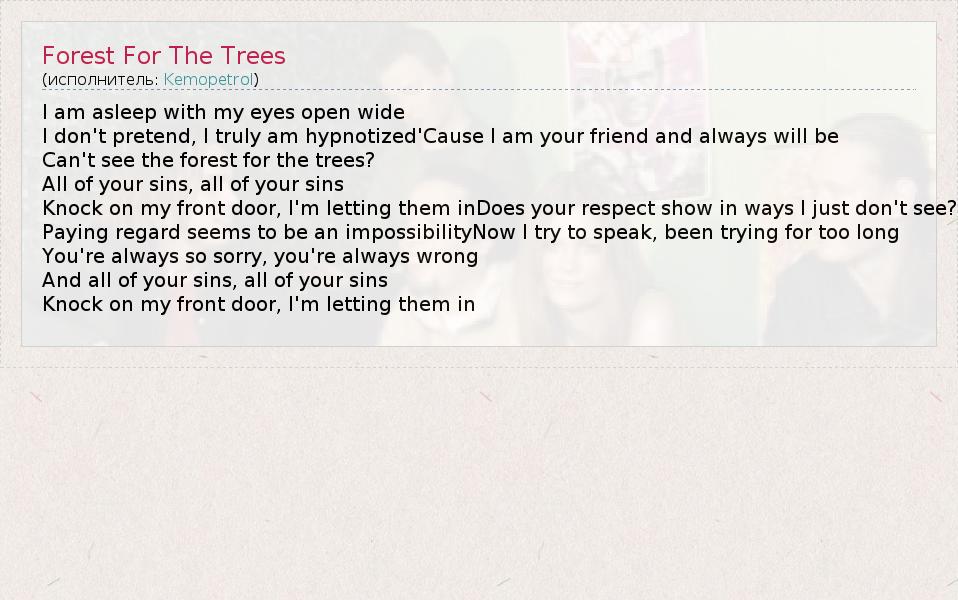 А как ты думаешь, о чем песня "Forest For The Trees" ?