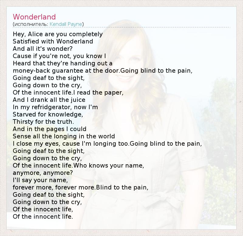 Hey, Alice are you completely Satisfied with Wonderland And all it's wonder? Cause if you're not, you know I Heard that they're handing out a money-back guarantee at the door.Going blind to the pain, Going deaf to the sight, Going down to the cry, Of the innocent life.I read the paper, And I drank all the juice In my refridgerator, now I'm Starved for knowledge, Thirsty for the truth. And in the pages I could Sense all the longing in the world I close my eyes, cause I'm longing too.Going blind to the pain, Going deaf to the sight, Going down to the cry, Of the innocent life.Who knows your name, anymore, anymore? I'll say your name, forever more, forever more.Blind to the pain, Going deaf to the sight, Going down to the cry, Of the innocent life, Of the innocent life.