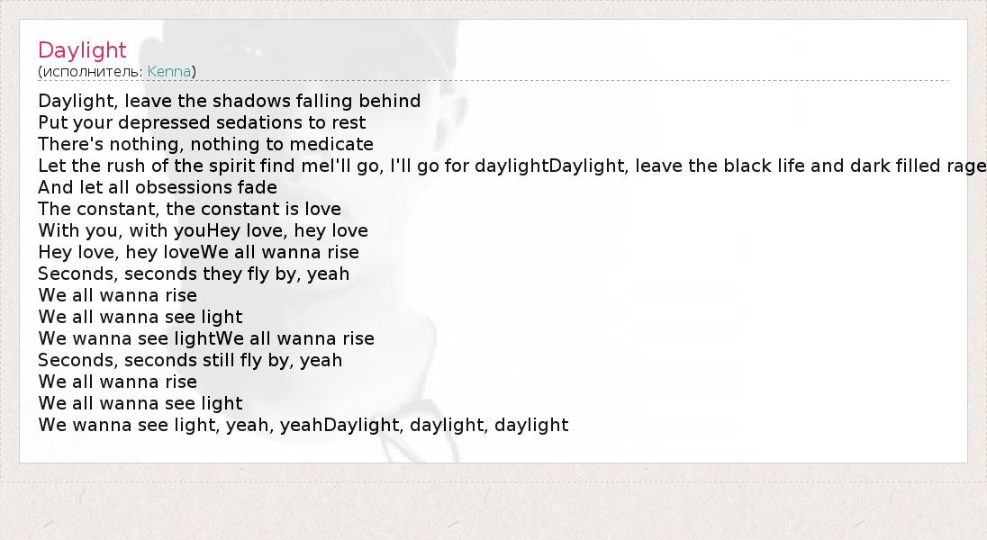 Daylight, leave the shadows falling behind Put your depressed sedations to rest There's nothing, nothing to medicate Let the rush of the spirit find meI'll go, I'll go for daylightDaylight, leave the black life and dark filled rage And let all obsessions fade The constant, the constant is love With you, with youHey love, hey love Hey love, hey loveWe all wanna rise Seconds, seconds they fly by, yeah We all wanna rise We all wanna see light We wanna see lightWe all wanna rise Seconds, seconds still fly by, yeah We all wanna rise We all wanna see light We wanna see light, yeah, yeahDaylight, daylight, daylight