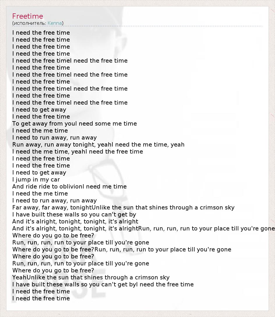 I need the free time I need the free time I need the free time I need the free time I need the free timeI need the free time I need the free time I need the free timeI need the free time I need the free time I need the free timeI need the free time I need the free time I need the free timeI need the free time I need to get away I need the free time To get away from youI need some me time I need the me time I need to run away, run away Run away, run away tonight, yeahI need the me time, yeah I need the me time, yeahI need the free time I need the free time I need the free time I need to get away I jump in my car And ride ride to oblivionI need me time I need the me time I need to run away, run away Far away, far away, tonightUnlike the sun that shines through a crimson sky I have built these walls so you can't get by And it's alright, tonight, tonight, it's alright And it's alright, tonight, tonight, it's alrightRun, run, run, run to your place till you're gone Where do you go to be free? Run, run, run, run to your place till you're gone Where do you go to be free?Run, run, run, run to your place till you're gone Where do you go to be free? Run, run, run, run to your place till you're gone Where do you go to be free? YeahUnlike the sun that shines through a crimson sky I have built these walls so you can't get byI need the free time I need the free time I need the free time