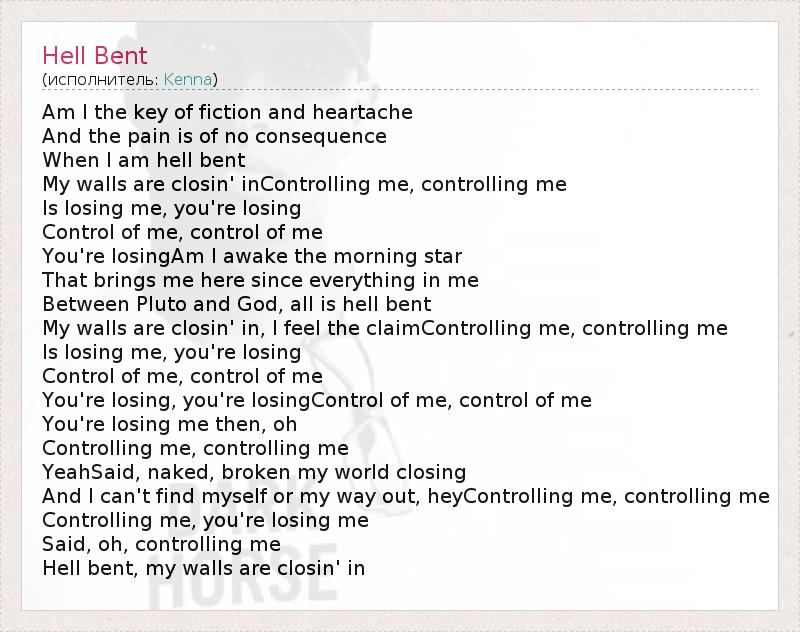 Am I the key of fiction and heartache And the pain is of no consequence When I am hell bent My walls are closin' inControlling me, controlling me Is losing me, you're losing Control of me, control of me You're losingAm I awake the morning star That brings me here since everything in me Between Pluto and God, all is hell bent My walls are closin' in, I feel the claimControlling me, controlling me Is losing me, you're losing Control of me, control of me You're losing, you're losingControl of me, control of me You're losing me then, oh Controlling me, controlling me YeahSaid, naked, broken my world closing And I can't find myself or my way out, heyControlling me, controlling me Controlling me, you're losing me Said, oh, controlling me Hell bent, my walls are closin' in