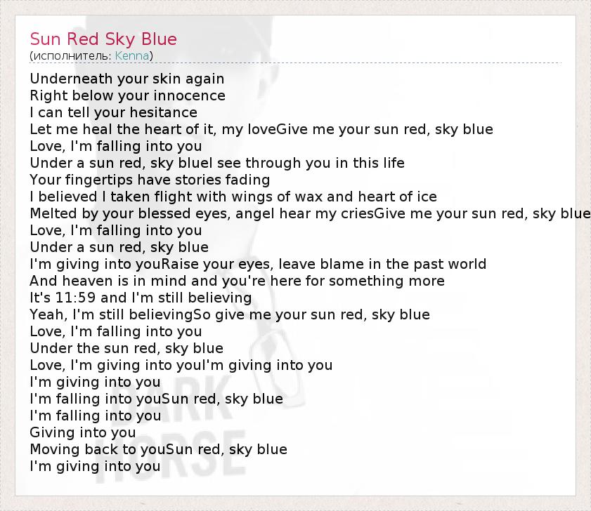 Underneath your skin again Right below your innocence I can tell your hesitance Let me heal the heart of it, my loveGive me your sun red, sky blue Love, I'm falling into you Under a sun red, sky blueI see through you in this life Your fingertips have stories fading I believed I taken flight with wings of wax and heart of ice Melted by your blessed eyes, angel hear my criesGive me your sun red, sky blue Love, I'm falling into you Under a sun red, sky blue I'm giving into youRaise your eyes, leave blame in the past world And heaven is in mind and you're here for something more It's 11:59 and I'm still believing Yeah, I'm still believingSo give me your sun red, sky blue Love, I'm falling into you Under the sun red, sky blue Love, I'm giving into youI'm giving into you I'm giving into you I'm falling into youSun red, sky blue I'm falling into you Giving into you Moving back to youSun red, sky blue I'm giving into you