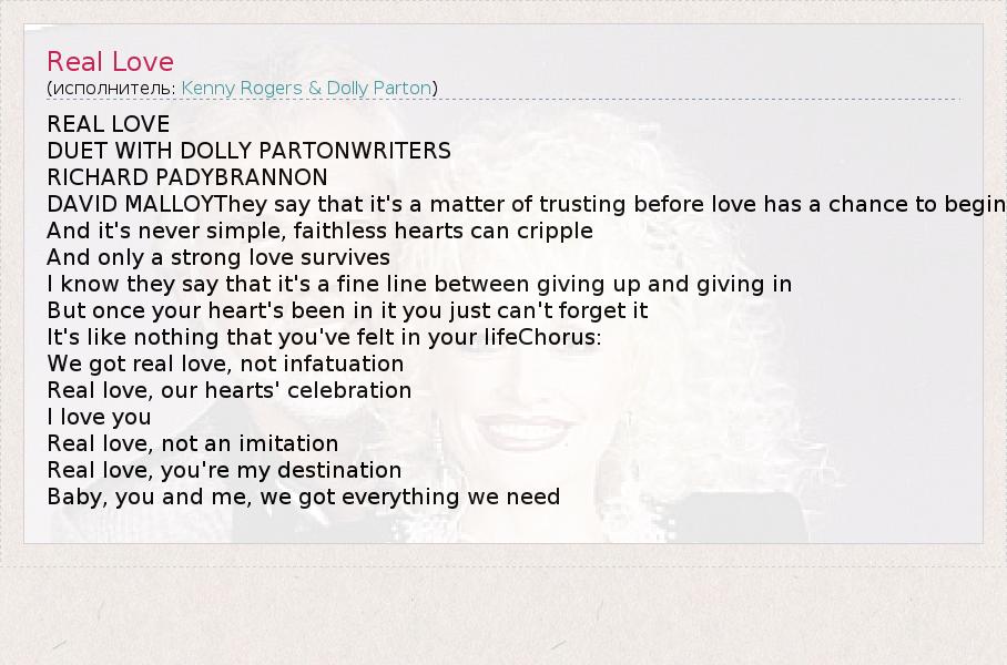 REAL LOVE DUET WITH DOLLY PARTONWRITERS RICHARD PADYBRANNON DAVID MALLOYThey say that it's a matter of trusting before love has a chance to begin And it's never simple, faithless hearts can cripple And only a strong love survives I know they say that it's a fine line between giving up and giving in But once your heart's been in it you just can't forget it It's like nothing that you've felt in your lifeChorus: We got real love, not infatuation Real love, our hearts' celebration I love you Real love, not an imitation Real love, you're my destination Baby, you and me, we got everything we need