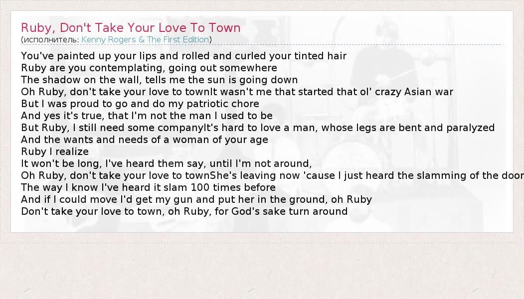 А как ты думаешь, о чем песня "Ruby, Don't Take Your Love To Town" ?