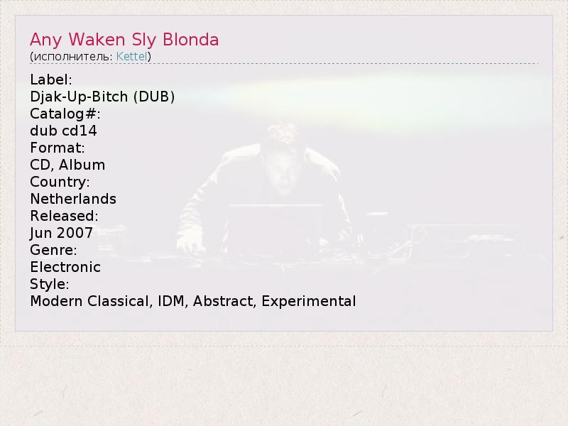 Label: Djak-Up-Bitch (DUB) Catalog#: dub cd14 Format: CD, Album Country: Netherlands Released: Jun 2007 Genre: Electronic Style: Modern Classical, IDM, Abstract, Experimental