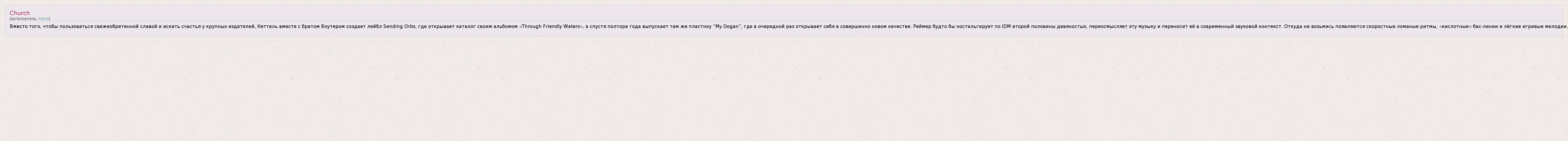 Это интересно:Реймер Эйсинг, он же Kettel – фигура, фактически связывающая старую школу IDM с новой. Старту карьеры Реймера во многом поспособствовали два «живых классика» британской электроники. Сначала Майк Парадинас aka u-Ziq приютил молодого голландца на свой лейбл Planet Mu, выпустив его дебютную семидюймовку «Atomic Tadley», а чуть позже в поклонники Кеттеля записался Ли Норрис (Metamatics), который немедленно подписал... продолжение