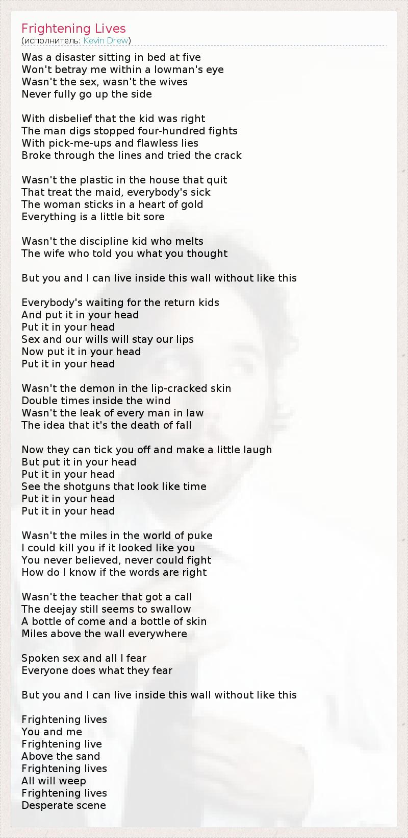 Was a disaster sitting in bed at five Won't betray me within a lowman's eye Wasn't the sex, wasn't the wives Never fully go up the side With disbelief that the kid was right The man digs stopped four-hundred fights With pick-me-ups and flawless lies Broke through the lines and tried the crack Wasn't the plastic in the house that quit That treat the maid, everybody's sick The woman sticks in a heart of gold Everything is a little bit sore Wasn't the discipline kid who melts The wife who told you what you thought But you and I can live inside this wall without like this Everybody's waiting for the return kids And put it in your head Put it in your head Sex and our wills will stay our lips Now put it in your head Put it in your head Wasn't the demon in the lip-cracked skin Double times inside the wind Wasn't the leak of every man in law The idea that it's the death of fall Now they can tick you off and make a little laugh But put it in your head Put it in your head See the shotguns that look like time Put it in your head Put it in your head Wasn't the miles in the world of puke I could kill you if it looked like you You never believed, never could fight How do I know if the words are right Wasn't the teacher that got a call The deejay still seems to swallow A bottle of come and a bottle of skin Miles above the wall everywhere Spoken sex and all I fear Everyone does what they fear But you and I can live inside this wall without like this Frightening lives You and me Frightening live Above the sand Frightening lives All will weep Frightening lives Desperate scene