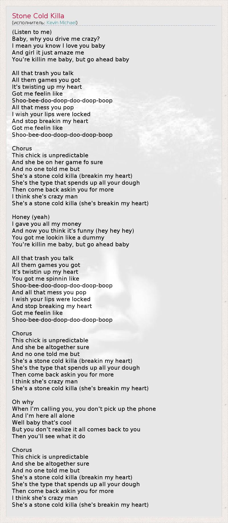 (Listen to me) Baby, why you drive me crazy? I mean you know I love you baby And girl it just amaze me You're killin me baby, but go ahead baby All that trash you talk All them games you got It's twisting up my heart Got me feelin like Shoo-bee-doo-doop-doo-doop-boop All that mess you pop I wish your lips were locked And stop breakin my heart Got me feelin like Shoo-bee-doo-doop-doo-doop-boop Chorus This chick is unpredictable And she be on her game fo sure And no one told me but She's a stone cold killa (breakin my heart) She's the type that spends up all your dough Then come back askin you for more I think she's crazy man She's a stone cold killa (she's breakin my heart) Honey (yeah) I gave you all my money And now you think it's funny (hey hey hey) You got me lookin like a dummy You're killin me baby, but go ahead baby All that trash you talk All them games you got It's twistin up my heart You got me spinnin like Shoo-bee-doo-doop-doo-doop-boop And all that mess you pop I wish your lips were locked And stop breaking my heart Got me feelin like Shoo-bee-doo-doop-doo-doop-boop Chorus This chick is unpredictable And she be altogether sure And no one told me but She's a stone cold killa (breakin my heart) She's the type that spends up all your dough Then come back askin you for more I think she's crazy man She's a stone cold killa (she's breakin my heart) Oh why When I'm calling you, you don't pick up the phone And I'm here all alone Well baby that's cool But you don't realize it all comes back to you Then you'll see what it do Chorus This chick is unpredictable And she be altogether sure And no one told me but She's a stone cold killa (breakin my heart) She's the type that spends up all your dough Then come back askin you for more I think she's crazy man She's a stone cold killa (she's breakin my heart)