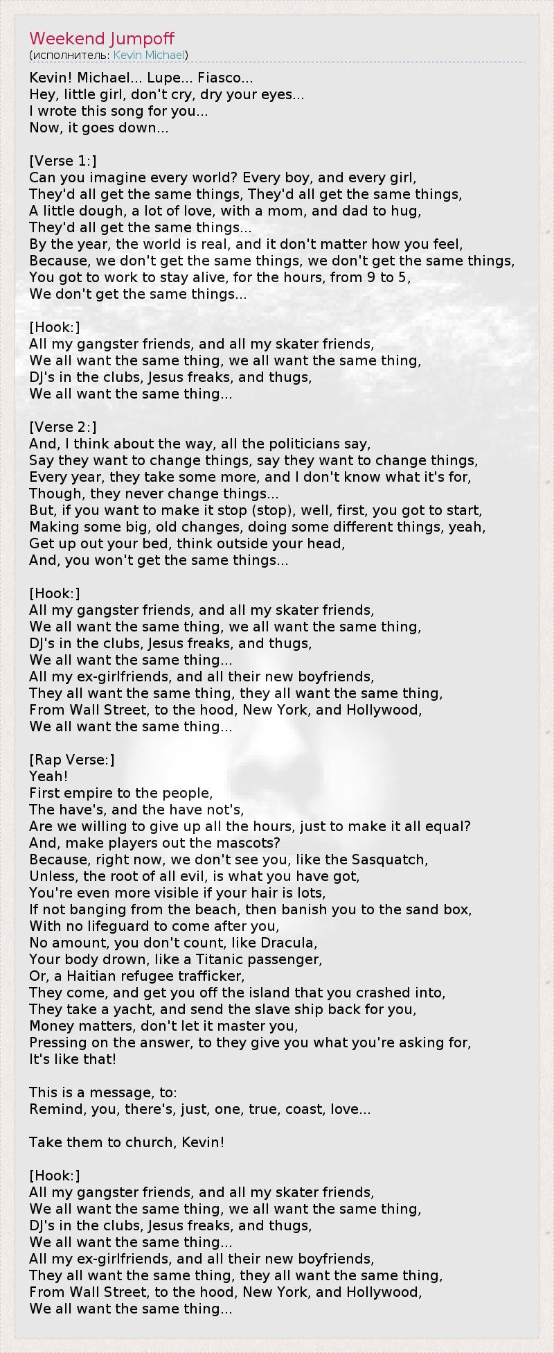 Kevin! Michael... Lupe... Fiasco... Hey, little girl, don't cry, dry your eyes... I wrote this song for you... Now, it goes down... [Verse 1:] Can you imagine every world? Every boy, and every girl, They'd all get the same things, They'd all get the same things, A little dough, a lot of love, with a mom, and dad to hug, They'd all get the same things... By the year, the world is real, and it don't matter how you feel, Because, we don't get the same things, we don't get the same things, You got to work to stay alive, for the hours, from 9 to 5, We don't get the same things... [Hook:] All my gangster friends, and all my skater friends, We all want the same thing, we all want the same thing, DJ's in the clubs, Jesus freaks, and thugs, We all want the same thing... [Verse 2:] And, I think about the way, all the politicians say, Say they want to change things, say they want to change things, Every year, they take some more, and I don't know what it's for, Though, they never change things... But, if you want to make it stop (stop), well, first, you got to start, Making some big, old changes, doing some different things, yeah, Get up out your bed, think outside your head, And, you won't get the same things... [Hook:] All my gangster friends, and all my skater friends, We all want the same thing, we all want the same thing, DJ's in the clubs, Jesus freaks, and thugs, We all want the same thing... All my ex-girlfriends, and all their new boyfriends, They all want the same thing, they all want the same thing, From Wall Street, to the hood, New York, and Hollywood, We all want the same thing... [Rap Verse:] Yeah! First empire to the people, The have's, and the have not's, Are we willing to give up all the hours, just to make it all equal? And, make players out the mascots? Because, right now, we don't see you, like the Sasquatch, Unless, the root of all evil, is what you have got, You're even more visible if your hair is lots, If not banging from the beach, then banish you to the sand box, With no lifeguard to come after you, No amount, you don't count, like Dracula, Your body drown, like a Titanic passenger, Or, a Haitian refugee trafficker, They come, and get you off the island that you crashed into, They take a yacht, and send the slave ship back for you, Money matters, don't let it master you, Pressing on the answer, to they give you what you're asking for, It's like that! This is a message, to: Remind, you, there's, just, one, true, coast, love... Take them to church, Kevin! [Hook:] All my gangster friends, and all my skater friends, We all want the same thing, we all want the same thing, DJ's in the clubs, Jesus freaks, and thugs, We all want the same thing... All my ex-girlfriends, and all their new boyfriends, They all want the same thing, they all want the same thing, From Wall Street, to the hood, New York, and Hollywood, We all want the same thing...
