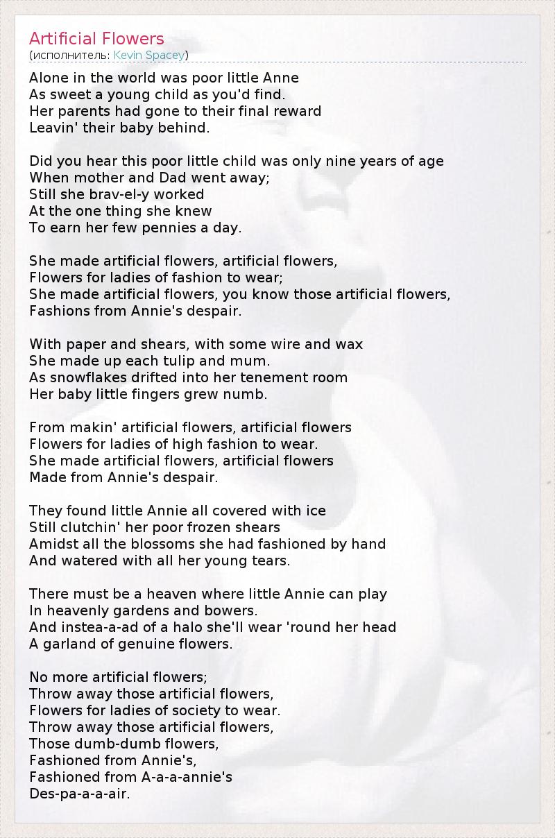 Alone in the world was poor little Anne As sweet a young child as you'd find. Her parents had gone to their final reward Leavin' their baby behind. Did you hear this poor little child was only nine years of age When mother and Dad went away; Still she brav-el-y worked At the one thing she knew To earn her few pennies a day. She made artificial flowers, artificial flowers, Flowers for ladies of fashion to wear; She made artificial flowers, you know those artificial flowers, Fashions from Annie's despair. With paper and shears, with some wire and wax She made up each tulip and mum. As snowflakes drifted into her tenement room Her baby little fingers grew numb. From makin' artificial flowers, artificial flowers Flowers for ladies of high fashion to wear. She made artificial flowers, artificial flowers Made from Annie's despair. They found little Annie all covered with ice Still clutchin' her poor frozen shears Amidst all the blossoms she had fashioned by hand And watered with all her young tears. There must be a heaven where little Annie can play In heavenly gardens and bowers. And instea-a-ad of a halo she'll wear 'round her head A garland of genuine flowers. No more artificial flowers; Throw away those artificial flowers, Flowers for ladies of society to wear. Throw away those artificial flowers, Those dumb-dumb flowers, Fashioned from Annie's, Fashioned from A-a-a-annie's Des-pa-a-a-air.