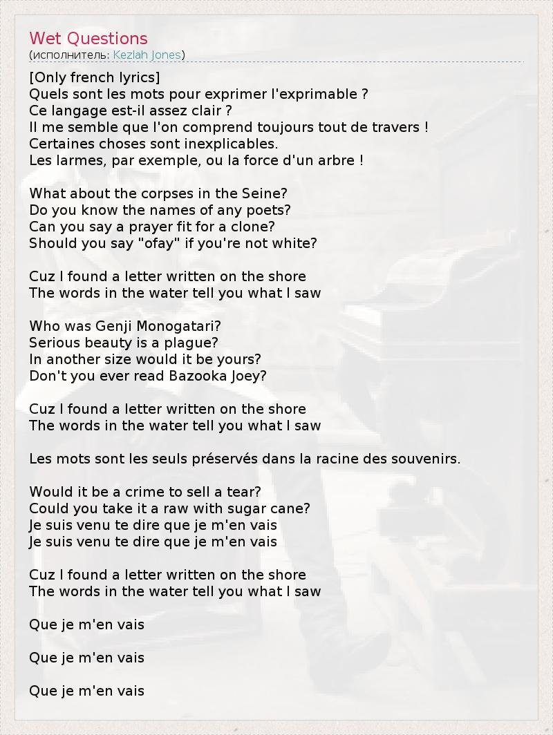 [Only french lyrics] Quels sont les mots pour exprimer l'exprimable ? Ce langage est-il assez clair ? Il me semble que l'on comprend toujours tout de travers ! Certaines choses sont inexplicables. Les larmes, par exemple, ou la force d'un arbre ! What about the corpses in the Seine? Do you know the names of any poets? Can you say a prayer fit for a clone? Should you say "ofay" if you're not white? Cuz I found a letter written on the shore The words in the water tell you what I saw Who was Genji Monogatari? Serious beauty is a plague? In another size would it be yours? Don't you ever read Bazooka Joey? Cuz I found a letter written on the shore The words in the water tell you what I saw Les mots sont les seuls préservés dans la racine des souvenirs. Would it be a crime to sell a tear? Could you take it a raw with sugar cane? Je suis venu te dire que je m'en vais Je suis venu te dire que je m'en vais Cuz I found a letter written on the shore The words in the water tell you what I saw Que je m'en vais Que je m'en vais Que je m'en vais