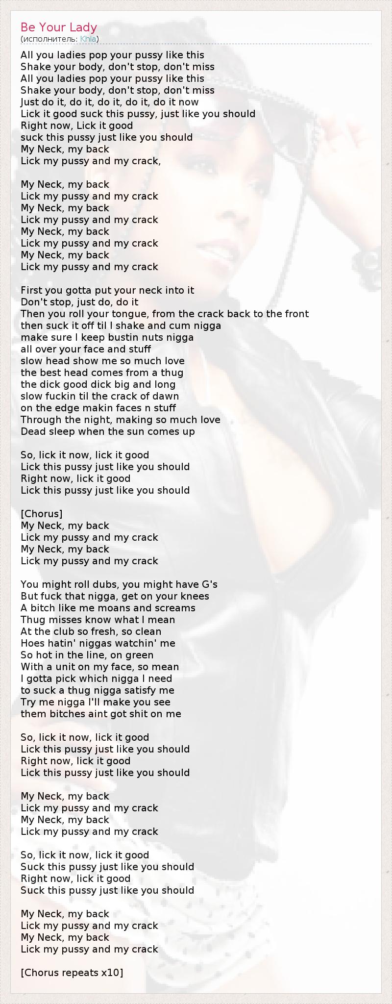 All you ladies pop your pussy like this Shake your body, don't stop, don't miss All you ladies pop your pussy like this Shake your body, don't stop, don't miss Just do it, do it, do it, do it, do it now Lick it good suck this pussy, just like you should Right now, Lick it good suck this pussy just like you should My Neck, my back Lick my pussy and my crack, My Neck, my back Lick my pussy and my crack My Neck, my back Lick my pussy and my crack My Neck, my back Lick my pussy and my crack My Neck, my back Lick my pussy and my crack First you gotta put your neck into it Don't stop, just do, do it Then you roll your tongue, from the crack back to the front then suck it off til I shake and cum nigga make sure I keep bustin nuts nigga all over your face and stuff slow head show me so much love the best head comes from a thug the dick good dick big and long slow fuckin til the crack of dawn on the edge makin faces n stuff Through the night, making so much love Dead sleep when the sun comes up So, lick it now, lick it good Lick this pussy just like you should Right now, lick it good Lick this pussy just like you should [Chorus] My Neck, my back Lick my pussy and my crack My Neck, my back Lick my pussy and my crack You might roll dubs, you might have G's But fuck that nigga, get on your knees A bitch like me moans and screams Thug misses know what I mean At the club so fresh, so clean Hoes hatin' niggas watchin' me So hot in the line, on green With a unit on my face, so mean I gotta pick which nigga I need to suck a thug nigga satisfy me Try me nigga I'll make you see them bitches aint got shit on me So, lick it now, lick it good Lick this pussy just like you should Right now, lick it good Lick this pussy just like you should My Neck, my back Lick my pussy and my crack My Neck, my back Lick my pussy and my crack So, lick it now, lick it good Suck this pussy just like you should Right now, lick it good Suck this pussy just like you should My Neck, my back Lick my pussy and my crack My Neck, my back Lick my pussy and my crack [Chorus repeats x10]