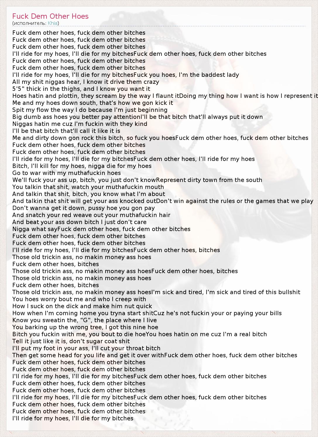 Fuck dem other hoes, fuck dem other bitches Fuck dem other hoes, fuck dem other bitches Fuck dem other hoes, fuck dem other bitches I'll ride for my hoes, I'll die for my bitchesFuck dem other hoes, fuck dem other bitches Fuck dem other hoes, fuck dem other bitches Fuck dem other hoes, fuck dem other bitches I'll ride for my hoes, I'll die for my bitchesFuck you hoes, I'm the baddest lady All my shit niggas hear, I know it drive them crazy 5'5" thick in the thighs, and I know you want it Hoes hatin and plottin, they scream by the way I flaunt itDoing my thing how I want is how I represent it Me and my hoes down south, that's how we gon kick it Spit my flow the way I do because I'm just beginning Big dumb ass hoes you better pay attentionI'll be that bitch that'll always put it down Niggas hatin me cuz I'm fuckin with they kind I'll be that bitch that'll call it like it is Me and dirty down gon rock this bitch, so fuck you hoesFuck dem other hoes, fuck dem other bitches Fuck dem other hoes, fuck dem other bitches Fuck dem other hoes, fuck dem other bitches I'll ride for my hoes, I'll die for my bitchesFuck dem other hoes, I'll ride for my hoes Bitch, I'll kill for my hoes, nigga die for my hoes Go to war with my muthafuckin hoes We'll fuck your ass up, bitch, you just don't knowRepresent dirty town from the south You talkin that shit, watch your muthafuckin mouth And talkin that shit, bitch, you know what I'm about And talkin that shit will get your ass knocked outDon't win against the rules or the games that we play Don't wanna get it down, pussy hoe you gon pay And snatch your red weave out your muthafuckin hair And beat your ass down bitch I just don't care Nigga what sayFuck dem other hoes, fuck dem other bitches Fuck dem other hoes, fuck dem other bitches Fuck dem other hoes, fuck dem other bitches I'll ride for my hoes, I'll die for my bitchesFuck dem other hoes, bitches Those old trickin ass, no makin money ass hoes Fuck dem other hoes, bitches Those old trickin ass, no makin money ass hoesFuck dem other hoes, bitches Those old trickin ass, no makin money ass hoes Fuck dem other hoes, bitches Those old trickin ass, no makin money ass hoesI'm sick and tired, I'm sick and tired of this bullshit You hoes worry bout me and who I creep with How I suck on the dick and make him nut quick How when I'm coming home you tryna start shitCuz he's not fuckin your or paying your bills Know you sweatin the, "G", the place where I live You barking up the wrong tree, I got this nine hoe Bitch you fuckin with me, you bout to die hoeYou hoes hatin on me cuz I'm a real bitch Tell it just like it is, don't sugar coat shit I'll put my foot in your ass, I'll cut your throat bitch Then get some head for you life and get it over withFuck dem other hoes, fuck dem other bitches Fuck dem other hoes, fuck dem other bitches Fuck dem other hoes, fuck dem other bitches I'll ride for my hoes, I'll die for my bitchesFuck dem other hoes, fuck dem other bitches Fuck dem other hoes, fuck dem other bitches Fuck dem other hoes, fuck dem other bitches I'll ride for my hoes, I'll die for my bitchesFuck dem other hoes, fuck dem other bitches Fuck dem other hoes, fuck dem other bitches Fuck dem other hoes, fuck dem other bitches I'll ride for my hoes, I'll die for my bitches
