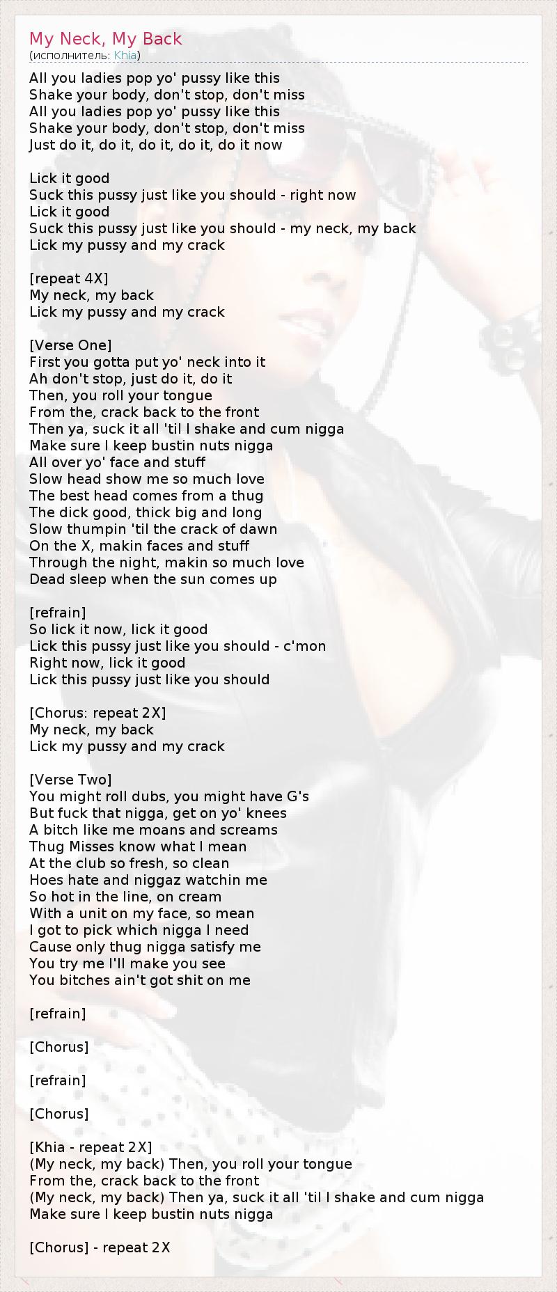 All you ladies pop yo' pussy like this Shake your body, don't stop, don't miss All you ladies pop yo' pussy like this Shake your body, don't stop, don't miss Just do it, do it, do it, do it, do it now Lick it good Suck this pussy just like you should - right now Lick it good Suck this pussy just like you should - my neck, my back Lick my pussy and my crack [repeat 4X] My neck, my back Lick my pussy and my crack [Verse One] First you gotta put yo' neck into it Ah don't stop, just do it, do it Then, you roll your tongue From the, crack back to the front Then ya, suck it all 'til I shake and cum nigga Make sure I keep bustin nuts nigga All over yo' face and stuff Slow head show me so much love The best head comes from a thug The dick good, thick big and long Slow thumpin 'til the crack of dawn On the X, makin faces and stuff Through the night, makin so much love Dead sleep when the sun comes up [refrain] So lick it now, lick it good Lick this pussy just like you should - c'mon Right now, lick it good Lick this pussy just like you should [Chorus: repeat 2X] My neck, my back Lick my pussy and my crack [Verse Two] You might roll dubs, you might have G's But fuck that nigga, get on yo' knees A bitch like me moans and screams Thug Misses know what I mean At the club so fresh, so clean Hoes hate and niggaz watchin me So hot in the line, on cream With a unit on my face, so mean I got to pick which nigga I need Cause only thug nigga satisfy me You try me I'll make you see You bitches ain't got shit on me [refrain] [Chorus] [refrain] [Chorus] [Khia - repeat 2X] (My neck, my back) Then, you roll your tongue From the, crack back to the front (My neck, my back) Then ya, suck it all 'til I shake and cum nigga Make sure I keep bustin nuts nigga [Chorus] - repeat 2X