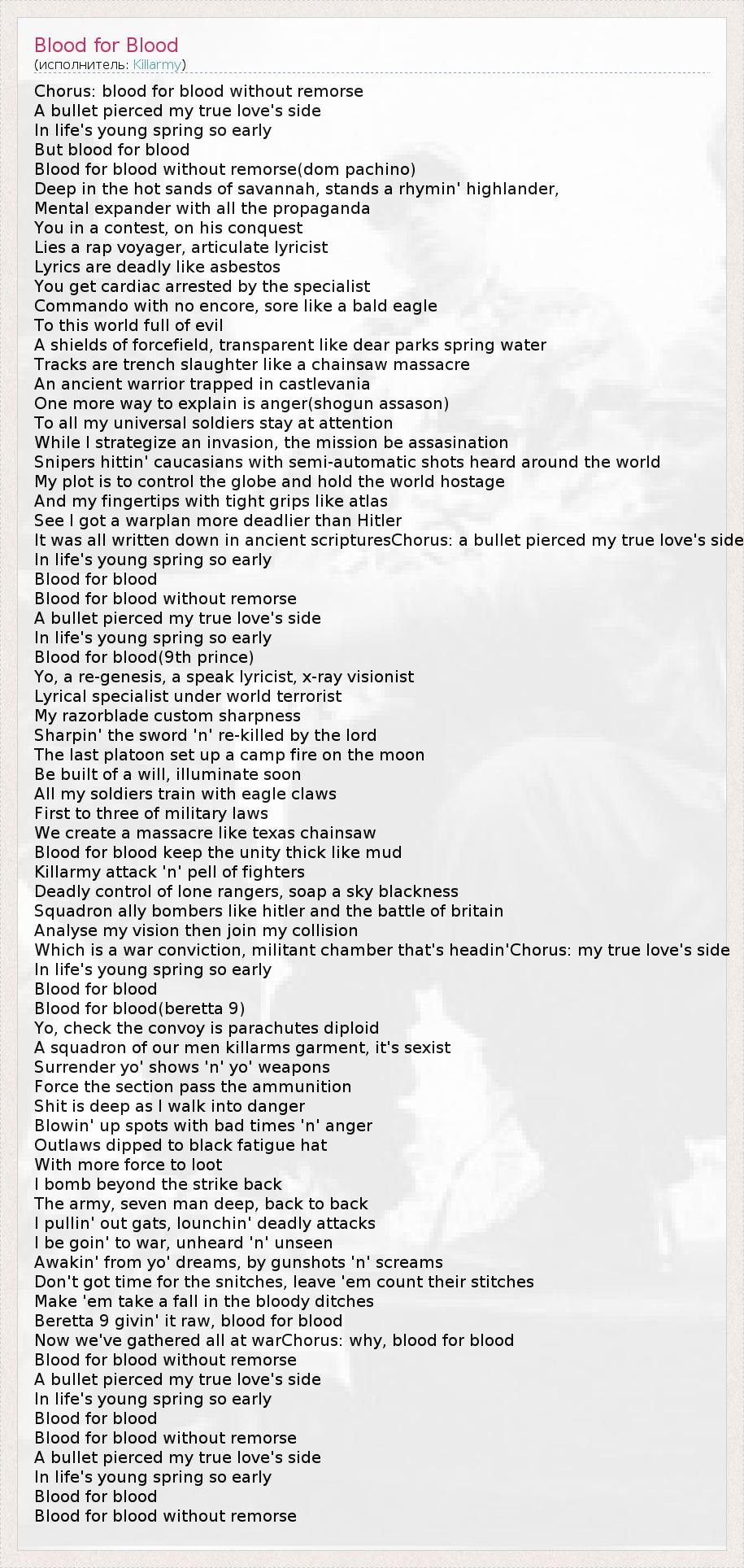 Chorus: blood for blood without remorse A bullet pierced my true love's side In life's young spring so early But blood for blood Blood for blood without remorse(dom pachino) Deep in the hot sands of savannah, stands a rhymin' highlander, Mental expander with all the propaganda You in a contest, on his conquest Lies a rap voyager, articulate lyricist Lyrics are deadly like asbestos You get cardiac arrested by the specialist Commando with no encore, sore like a bald eagle To this world full of evil A shields of forcefield, transparent like dear parks spring water Tracks are trench slaughter like a chainsaw massacre An ancient warrior trapped in castlevania One more way to explain is anger(shogun assason) To all my universal soldiers stay at attention While I strategize an invasion, the mission be assasination Snipers hittin' caucasians with semi-automatic shots heard around the world My plot is to control the globe and hold the world hostage And my fingertips with tight grips like atlas See I got a warplan more deadlier than Hitler It was all written down in ancient scripturesChorus: a bullet pierced my true love's side In life's young spring so early Blood for blood Blood for blood without remorse A bullet pierced my true love's side In life's young spring so early Blood for blood(9th prince) Yo, a re-genesis, a speak lyricist, x-ray visionist Lyrical specialist under world terrorist My razorblade custom sharpness Sharpin' the sword 'n' re-killed by the lord The last platoon set up a camp fire on the moon Be built of a will, illuminate soon All my soldiers train with eagle claws First to three of military laws We create a massacre like texas chainsaw Blood for blood keep the unity thick like mud Killarmy attack 'n' pell of fighters Deadly control of lone rangers, soap a sky blackness Squadron ally bombers like hitler and the battle of britain Analyse my vision then join my collision Which is a war conviction, militant chamber that's headin'Chorus: my true love's side In life's young spring so early Blood for blood Blood for blood(beretta 9) Yo, check the convoy is parachutes diploid A squadron of our men killarms garment, it's sexist Surrender yo' shows 'n' yo' weapons Force the section pass the ammunition Shit is deep as I walk into danger Blowin' up spots with bad times 'n' anger Outlaws dipped to black fatigue hat With more force to loot I bomb beyond the strike back The army, seven man deep, back to back I pullin' out gats, lounchin' deadly attacks I be goin' to war, unheard 'n' unseen Awakin' from yo' dreams, by gunshots 'n' screams Don't got time for the snitches, leave 'em count their stitches Make 'em take a fall in the bloody ditches Beretta 9 givin' it raw, blood for blood Now we've gathered all at warChorus: why, blood for blood Blood for blood without remorse A bullet pierced my true love's side In life's young spring so early Blood for blood Blood for blood without remorse A bullet pierced my true love's side In life's young spring so early Blood for blood Blood for blood without remorse