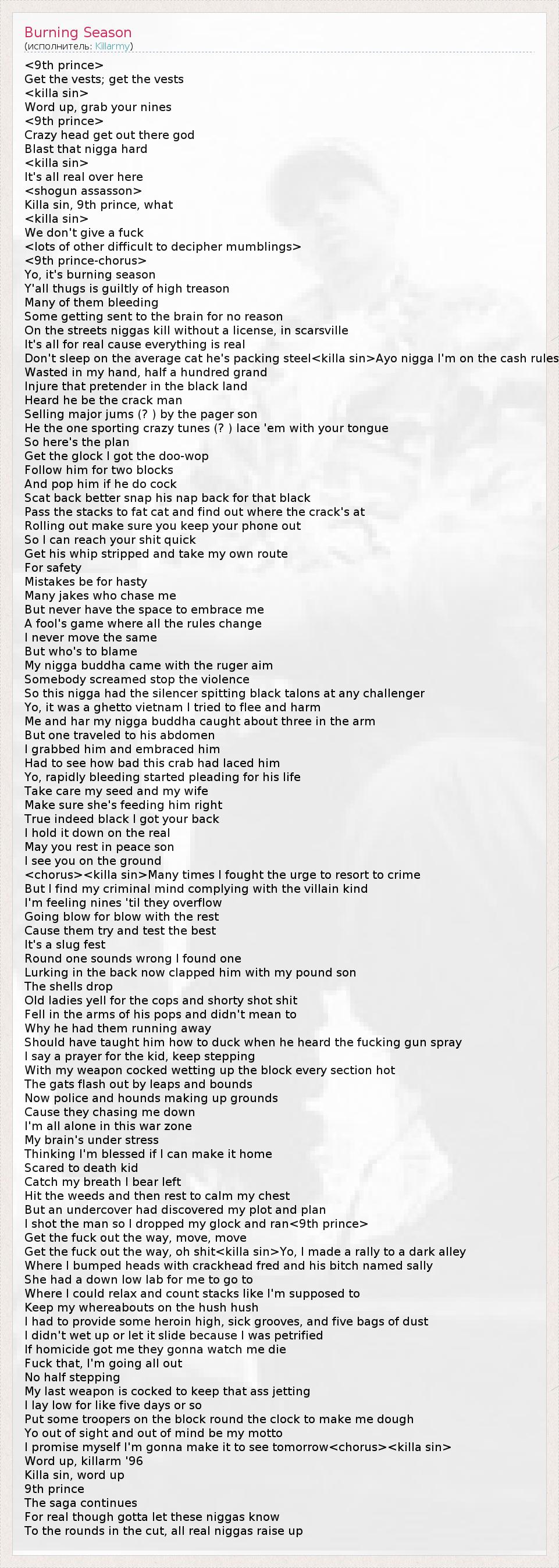 <9th prince> Get the vests; get the vests <killa sin> Word up, grab your nines <9th prince> Crazy head get out there god Blast that nigga hard <killa sin> It's all real over here <shogun assasson> Killa sin, 9th prince, what <killa sin> We don't give a fuck <lots of other difficult to decipher mumblings> <9th prince-chorus> Yo, it's burning season Y'all thugs is guiltly of high treason Many of them bleeding Some getting sent to the brain for no reason On the streets niggas kill without a license, in scarsville It's all for real cause everything is real Don't sleep on the average cat he's packing steel<killa sin>Ayo nigga I'm on the cash rules Wasted in my hand, half a hundred grand Injure that pretender in the black land Heard he be the crack man Selling major jums (? ) by the pager son He the one sporting crazy tunes (? ) lace 'em with your tongue So here's the plan Get the glock I got the doo-wop Follow him for two blocks And pop him if he do cock Scat back better snap his nap back for that black Pass the stacks to fat cat and find out where the crack's at Rolling out make sure you keep your phone out So I can reach your shit quick Get his whip stripped and take my own route For safety Mistakes be for hasty Many jakes who chase me But never have the space to embrace me A fool's game where all the rules change I never move the same But who's to blame My nigga buddha came with the ruger aim Somebody screamed stop the violence So this nigga had the silencer spitting black talons at any challenger Yo, it was a ghetto vietnam I tried to flee and harm Me and har my nigga buddha caught about three in the arm But one traveled to his abdomen I grabbed him and embraced him Had to see how bad this crab had laced him Yo, rapidly bleeding started pleading for his life Take care my seed and my wife Make sure she's feeding him right True indeed black I got your back I hold it down on the real May you rest in peace son I see you on the ground <chorus><killa sin>Many times I fought the urge to resort to crime But I find my criminal mind complying with the villain kind I'm feeling nines 'til they overflow Going blow for blow with the rest Cause them try and test the best It's a slug fest Round one sounds wrong I found one Lurking in the back now clapped him with my pound son The shells drop Old ladies yell for the cops and shorty shot shit Fell in the arms of his pops and didn't mean to Why he had them running away Should have taught him how to duck when he heard the fucking gun spray I say a prayer for the kid, keep stepping With my weapon cocked wetting up the block every section hot The gats flash out by leaps and bounds Now police and hounds making up grounds Cause they chasing me down I'm all alone in this war zone My brain's under stress Thinking I'm blessed if I can make it home Scared to death kid Catch my breath I bear left Hit the weeds and then rest to calm my chest But an undercover had discovered my plot and plan I shot the man so I dropped my glock and ran<9th prince> Get the fuck out the way, move, move Get the fuck out the way, oh shit<killa sin>Yo, I made a rally to a dark alley Where I bumped heads with crackhead fred and his bitch named sally She had a down low lab for me to go to Where I could relax and count stacks like I'm supposed to Keep my whereabouts on the hush hush I had to provide some heroin high, sick grooves, and five bags of dust I didn't wet up or let it slide because I was petrified If homicide got me they gonna watch me die Fuck that, I'm going all out No half stepping My last weapon is cocked to keep that ass jetting I lay low for like five days or so Put some troopers on the block round the clock to make me dough Yo out of sight and out of mind be my motto I promise myself I'm gonna make it to see tomorrow<chorus><killa sin> Word up, killarm '96 Killa sin, word up 9th prince The saga continues For real though gotta let these niggas know To the rounds in the cut, all real niggas raise up