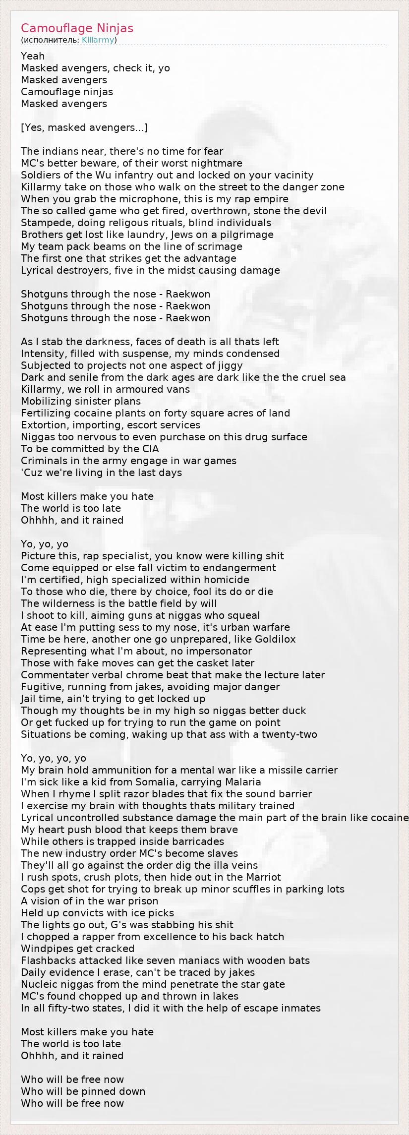 Yeah Masked avengers, check it, yo Masked avengers Camouflage ninjas Masked avengers [Yes, masked avengers...] The indians near, there's no time for fear MC's better beware, of their worst nightmare Soldiers of the Wu infantry out and locked on your vacinity Killarmy take on those who walk on the street to the danger zone When you grab the microphone, this is my rap empire The so called game who get fired, overthrown, stone the devil Stampede, doing religous rituals, blind individuals Brothers get lost like laundry, Jews on a pilgrimage My team pack beams on the line of scrimage The first one that strikes get the advantage Lyrical destroyers, five in the midst causing damage Shotguns through the nose - Raekwon Shotguns through the nose - Raekwon Shotguns through the nose - Raekwon As I stab the darkness, faces of death is all thats left Intensity, filled with suspense, my minds condensed Subjected to projects not one aspect of jiggy Dark and senile from the dark ages are dark like the the cruel sea Killarmy, we roll in armoured vans Mobilizing sinister plans Fertilizing cocaine plants on forty square acres of land Extortion, importing, escort services Niggas too nervous to even purchase on this drug surface To be committed by the CIA Criminals in the army engage in war games 'Cuz we're living in the last days Most killers make you hate The world is too late Ohhhh, and it rained Yo, yo, yo Picture this, rap specialist, you know were killing shit Come equipped or else fall victim to endangerment I'm certified, high specialized within homicide To those who die, there by choice, fool its do or die The wilderness is the battle field by will I shoot to kill, aiming guns at niggas who squeal At ease I'm putting sess to my nose, it's urban warfare Time be here, another one go unprepared, like Goldilox Representing what I'm about, no impersonator Those with fake moves can get the casket later Commentater verbal chrome beat that make the lecture later Fugitive, running from jakes, avoiding major danger Jail time, ain't trying to get locked up Though my thoughts be in my high so niggas better duck Or get fucked up for trying to run the game on point Situations be coming, waking up that ass with a twenty-two Yo, yo, yo, yo My brain hold ammunition for a mental war like a missile carrier I'm sick like a kid from Somalia, carrying Malaria When I rhyme I split razor blades that fix the sound barrier I exercise my brain with thoughts thats military trained Lyrical uncontrolled substance damage the main part of the brain like cocaine My heart push blood that keeps them brave While others is trapped inside barricades The new industry order MC's become slaves They'll all go against the order dig the illa veins I rush spots, crush plots, then hide out in the Marriot Cops get shot for trying to break up minor scuffles in parking lots A vision of in the war prison Held up convicts with ice picks The lights go out, G's was stabbing his shit I chopped a rapper from excellence to his back hatch Windpipes get cracked Flashbacks attacked like seven maniacs with wooden bats Daily evidence I erase, can't be traced by jakes Nucleic niggas from the mind penetrate the star gate MC's found chopped up and thrown in lakes In all fifty-two states, I did it with the help of escape inmates Most killers make you hate The world is too late Ohhhh, and it rained Who will be free now Who will be pinned down Who will be free now