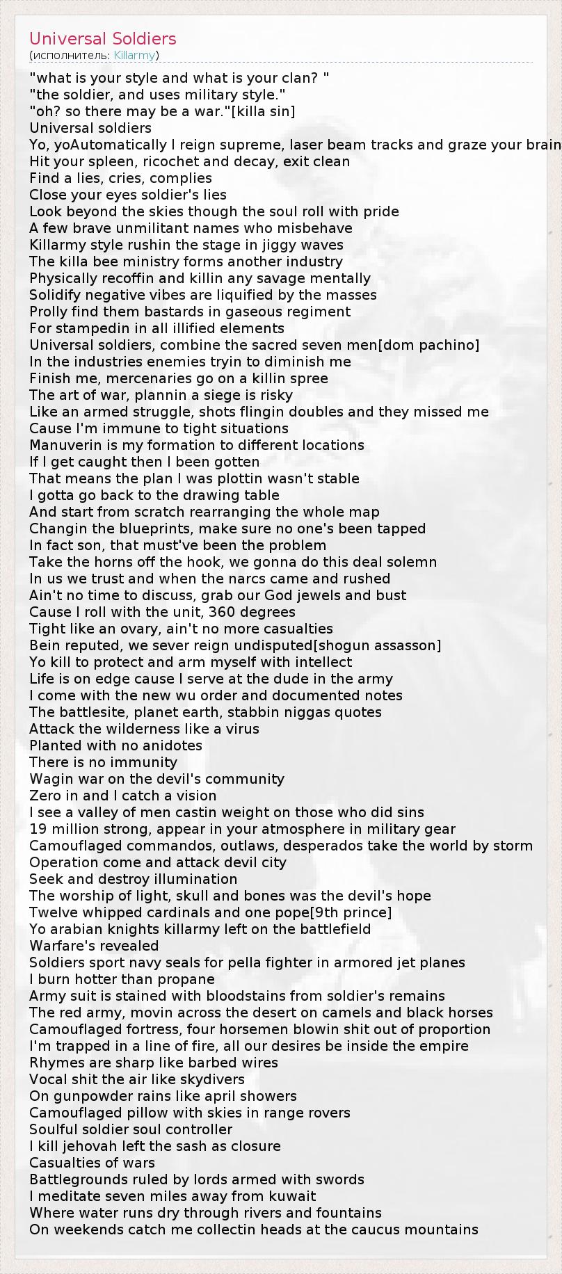 "what is your style and what is your clan? " "the soldier, and uses military style." "oh? so there may be a war."[killa sin] Universal soldiers Yo, yoAutomatically I reign supreme, laser beam tracks and graze your brain Hit your spleen, ricochet and decay, exit clean Find a lies, cries, complies Close your eyes soldier's lies Look beyond the skies though the soul roll with pride A few brave unmilitant names who misbehave Killarmy style rushin the stage in jiggy waves The killa bee ministry forms another industry Physically recoffin and killin any savage mentally Solidify negative vibes are liquified by the masses Prolly find them bastards in gaseous regiment For stampedin in all illified elements Universal soldiers, combine the sacred seven men[dom pachino] In the industries enemies tryin to diminish me Finish me, mercenaries go on a killin spree The art of war, plannin a siege is risky Like an armed struggle, shots flingin doubles and they missed me Cause I'm immune to tight situations Manuverin is my formation to different locations If I get caught then I been gotten That means the plan I was plottin wasn't stable I gotta go back to the drawing table And start from scratch rearranging the whole map Changin the blueprints, make sure no one's been tapped In fact son, that must've been the problem Take the horns off the hook, we gonna do this deal solemn In us we trust and when the narcs came and rushed Ain't no time to discuss, grab our God jewels and bust Cause I roll with the unit, 360 degrees Tight like an ovary, ain't no more casualties Bein reputed, we sever reign undisputed[shogun assasson] Yo kill to protect and arm myself with intellect Life is on edge cause I serve at the dude in the army I come with the new wu order and documented notes The battlesite, planet earth, stabbin niggas quotes Attack the wilderness like a virus Planted with no anidotes There is no immunity Wagin war on the devil's community Zero in and I catch a vision I see a valley of men castin weight on those who did sins 19 million strong, appear in your atmosphere in military gear Camouflaged commandos, outlaws, desperados take the world by storm Operation come and attack devil city Seek and destroy illumination The worship of light, skull and bones was the devil's hope Twelve whipped cardinals and one pope[9th prince] Yo arabian knights killarmy left on the battlefield Warfare's revealed Soldiers sport navy seals for pella fighter in armored jet planes I burn hotter than propane Army suit is stained with bloodstains from soldier's remains The red army, movin across the desert on camels and black horses Camouflaged fortress, four horsemen blowin shit out of proportion I'm trapped in a line of fire, all our desires be inside the empire Rhymes are sharp like barbed wires Vocal shit the air like skydivers On gunpowder rains like april showers Camouflaged pillow with skies in range rovers Soulful soldier soul controller I kill jehovah left the sash as closure Casualties of wars Battlegrounds ruled by lords armed with swords I meditate seven miles away from kuwait Where water runs dry through rivers and fountains On weekends catch me collectin heads at the caucus mountains