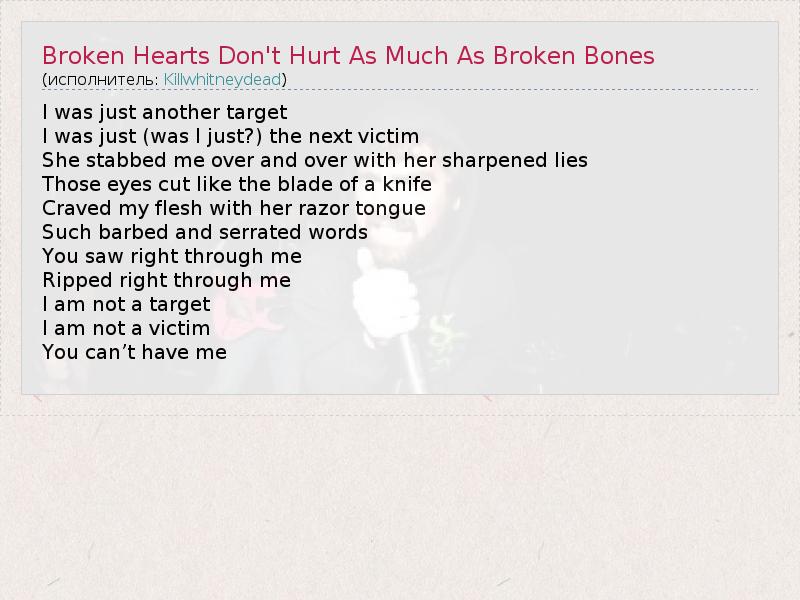 ГлавнаяИсполнителиKillwhitneydeadBroken Hearts Don't Hurt As Much As Broken Bones