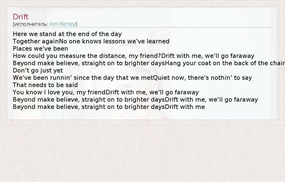 Here we stand at the end of the day Together againNo one knows lessons we've learned Places we've been How could you measure the distance, my friend?Drift with me, we'll go faraway Beyond make believe, straight on to brighter daysHang your coat on the back of the chair Don't go just yet We've been runnin' since the day that we metQuiet now, there's nothin' to say That needs to be said You know I love you, my friendDrift with me, we'll go faraway Beyond make believe, straight on to brighter daysDrift with me, we'll go faraway Beyond make believe, straight on to brighter daysDrift with me