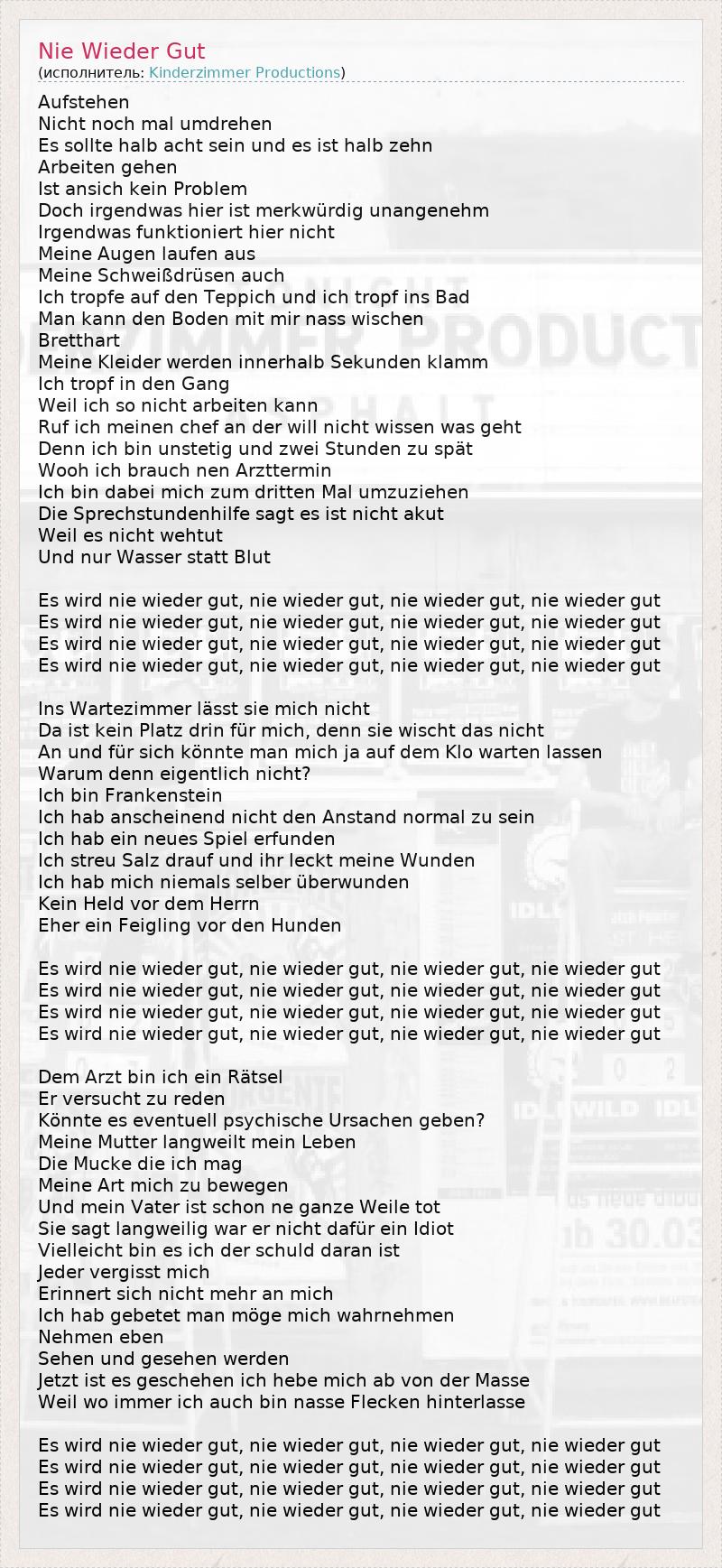 Aufstehen Nicht noch mal umdrehen Es sollte halb acht sein und es ist halb zehn Arbeiten gehen Ist ansich kein Problem Doch irgendwas hier ist merkwürdig unangenehm Irgendwas funktioniert hier nicht Meine Augen laufen aus Meine Schweißdrüsen auch Ich tropfe auf den Teppich und ich tropf ins Bad Man kann den Boden mit mir nass wischen Bretthart Meine Kleider werden innerhalb Sekunden klamm Ich tropf in den Gang Weil ich so nicht arbeiten kann Ruf ich meinen chef an der will nicht wissen was geht Denn ich bin unstetig und zwei Stunden zu spät Wooh ich brauch nen Arzttermin Ich bin dabei mich zum dritten Mal umzuziehen Die Sprechstundenhilfe sagt es ist nicht akut Weil es nicht wehtut Und nur Wasser statt Blut Es wird nie wieder gut, nie wieder gut, nie wieder gut, nie wieder gut Es wird nie wieder gut, nie wieder gut, nie wieder gut, nie wieder gut Es wird nie wieder gut, nie wieder gut, nie wieder gut, nie wieder gut Es wird nie wieder gut, nie wieder gut, nie wieder gut, nie wieder gut Ins Wartezimmer lässt sie mich nicht Da ist kein Platz drin für mich, denn sie wischt das nicht An und für sich könnte man mich ja auf dem Klo warten lassen Warum denn eigentlich nicht? Ich bin Frankenstein Ich hab anscheinend nicht den Anstand normal zu sein Ich hab ein neues Spiel erfunden Ich streu Salz drauf und ihr leckt meine Wunden Ich hab mich niemals selber überwunden Kein Held vor dem Herrn Eher ein Feigling vor den Hunden Es wird nie wieder gut, nie wieder gut, nie wieder gut, nie wieder gut Es wird nie wieder gut, nie wieder gut, nie wieder gut, nie wieder gut Es wird nie wieder gut, nie wieder gut, nie wieder gut, nie wieder gut Es wird nie wieder gut, nie wieder gut, nie wieder gut, nie wieder gut Dem Arzt bin ich ein Rätsel Er versucht zu reden Könnte es eventuell psychische Ursachen geben? Meine Mutter langweilt mein Leben Die Mucke die ich mag Meine Art mich zu bewegen Und mein Vater ist schon ne ganze Weile tot Sie sagt langweilig war er nicht dafür ein Idiot Vielleicht bin es ich der schuld daran ist Jeder vergisst mich Erinnert sich nicht mehr an mich Ich hab gebetet man möge mich wahrnehmen Nehmen eben Sehen und gesehen werden Jetzt ist es geschehen ich hebe mich ab von der Masse Weil wo immer ich auch bin nasse Flecken hinterlasse Es wird nie wieder gut, nie wieder gut, nie wieder gut, nie wieder gut Es wird nie wieder gut, nie wieder gut, nie wieder gut, nie wieder gut Es wird nie wieder gut, nie wieder gut, nie wieder gut, nie wieder gut Es wird nie wieder gut, nie wieder gut, nie wieder gut, nie wieder gut